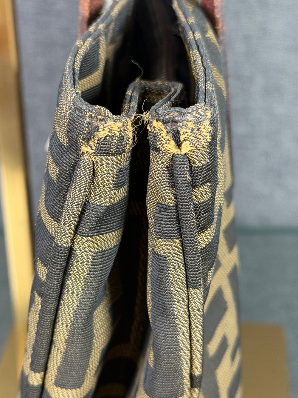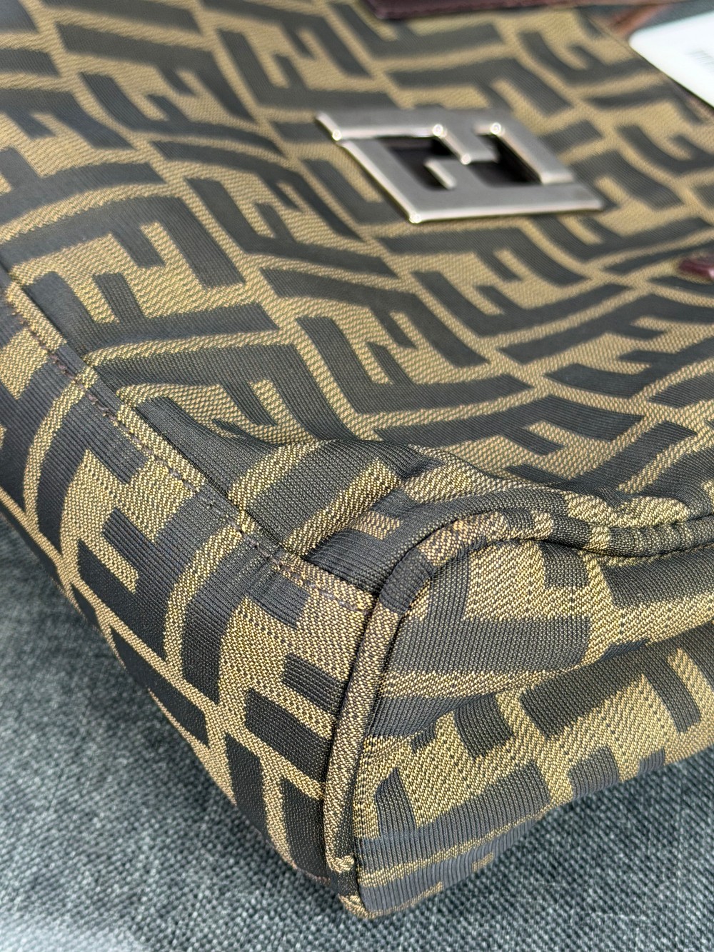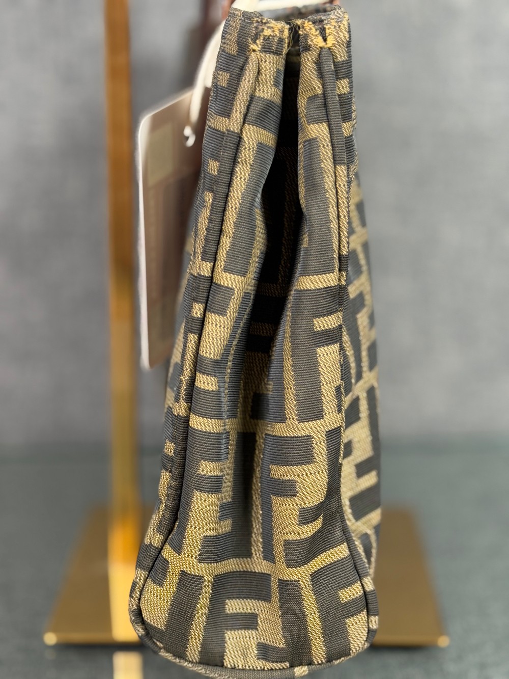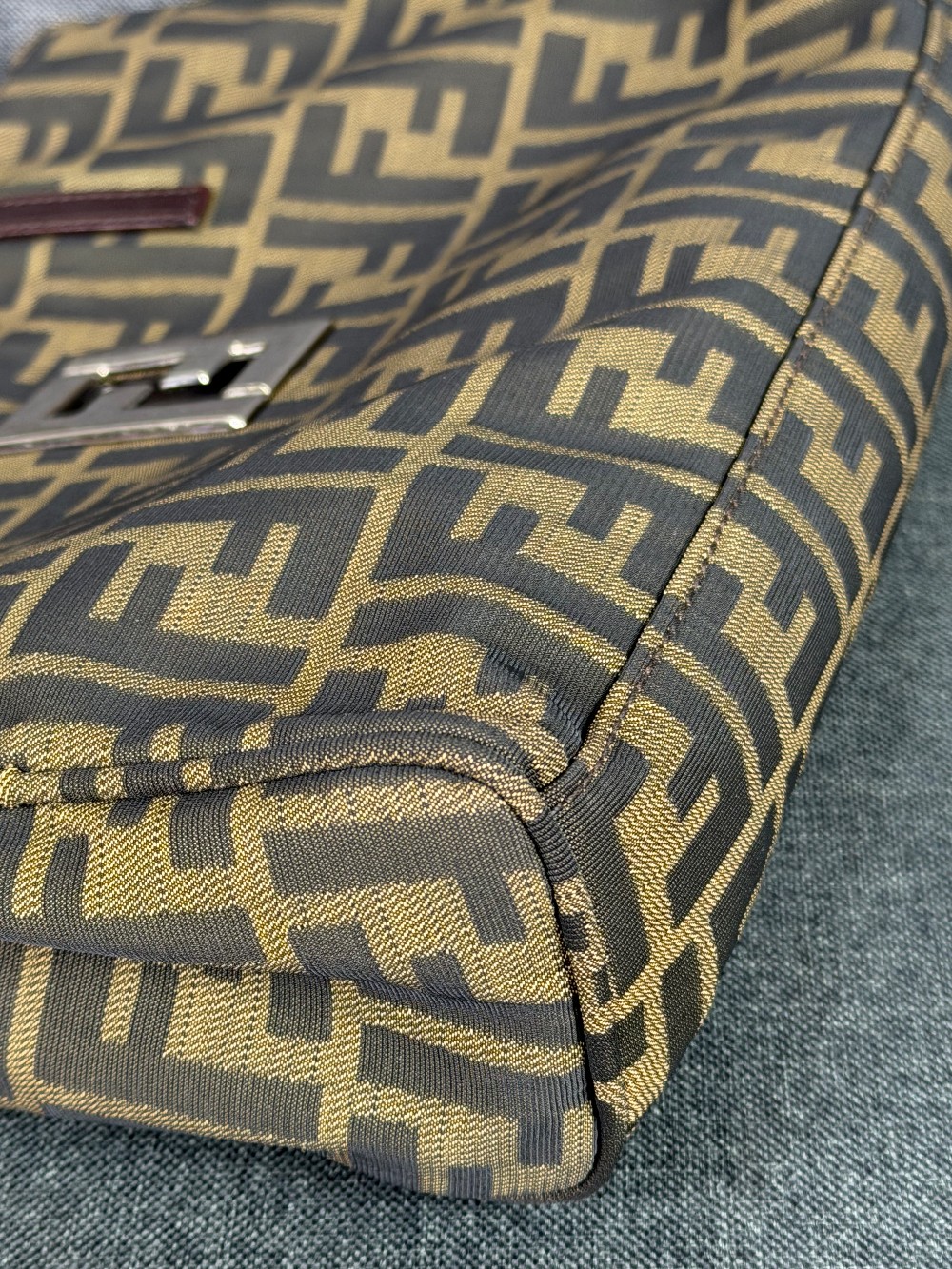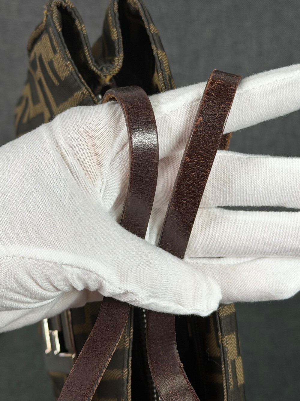 The material features the all-over brown and tan FF logo print (Zucca pattern) on canvas.