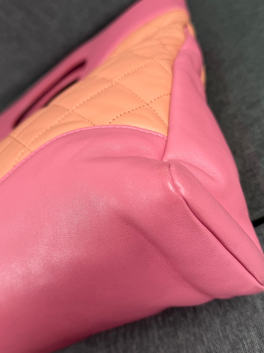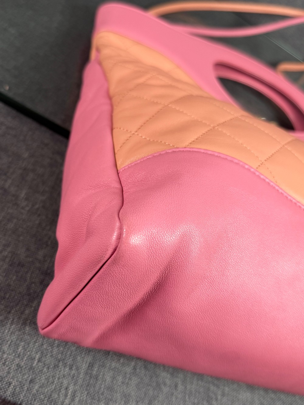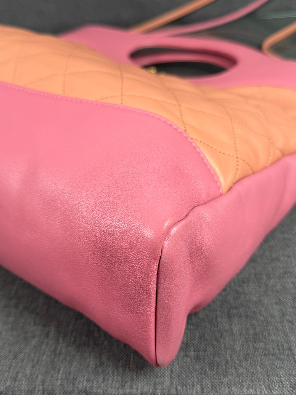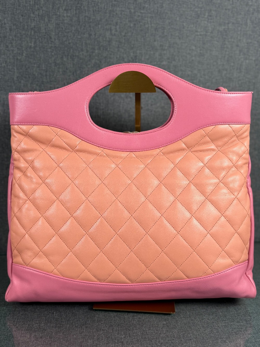 This is an authentic CHANEL Calfskin Suede Quilted 31 Shopping Bag in Pink. This stylish tote is crafted of padded diamond quilted suede leather in pink with smooth leather trim. The bag features pink handles, long leather shoulder straps, and a gold Chanel CC turn lock. The top is open to a pink fabric interior with two zipper pocket.