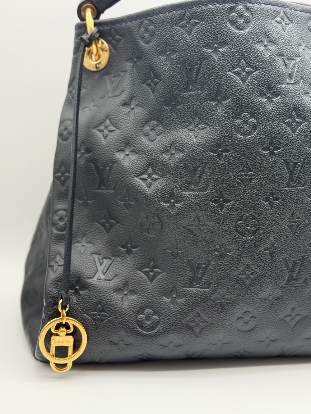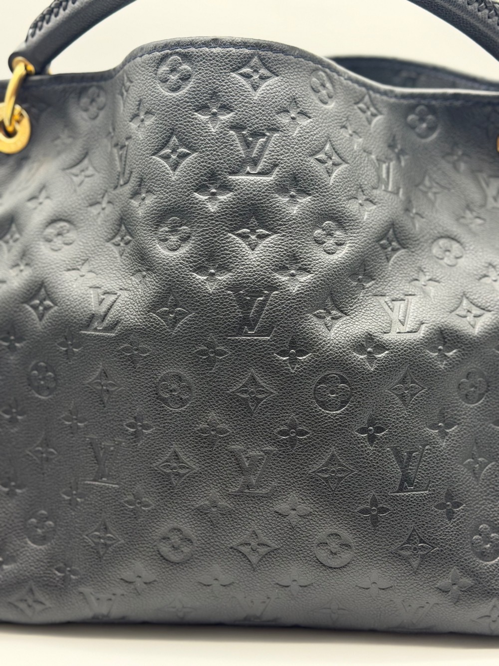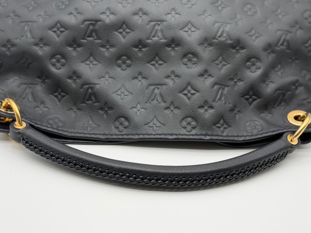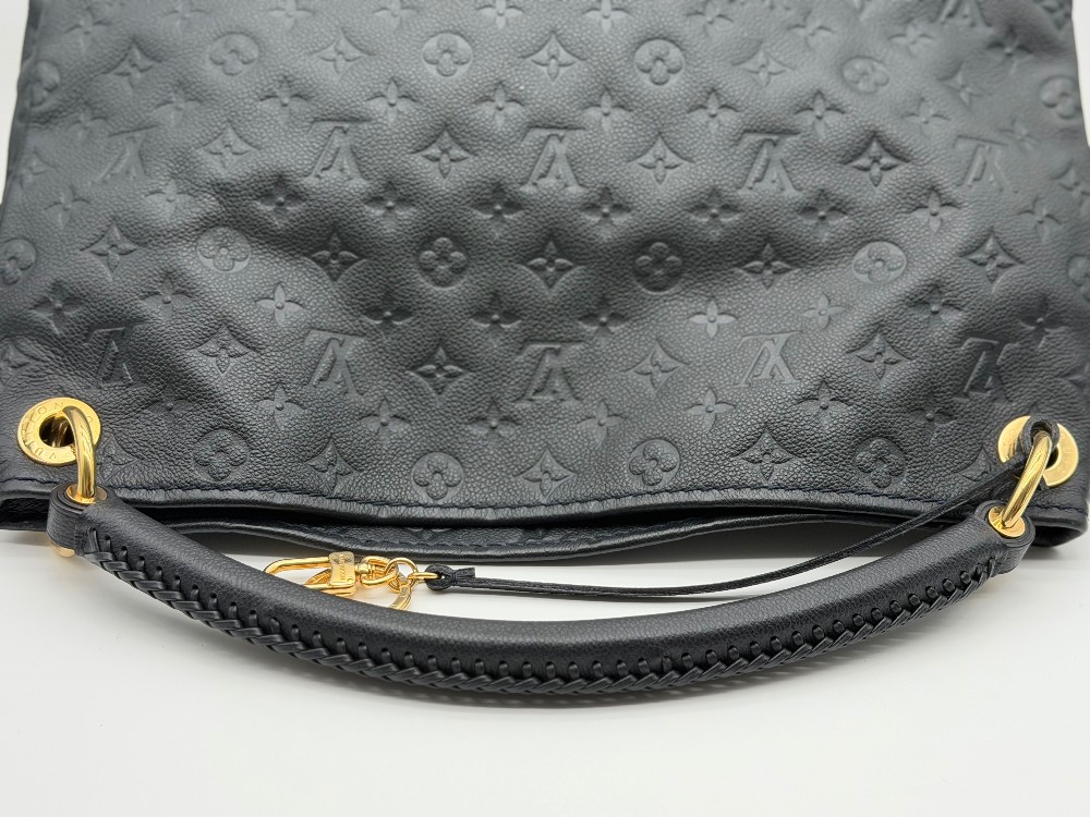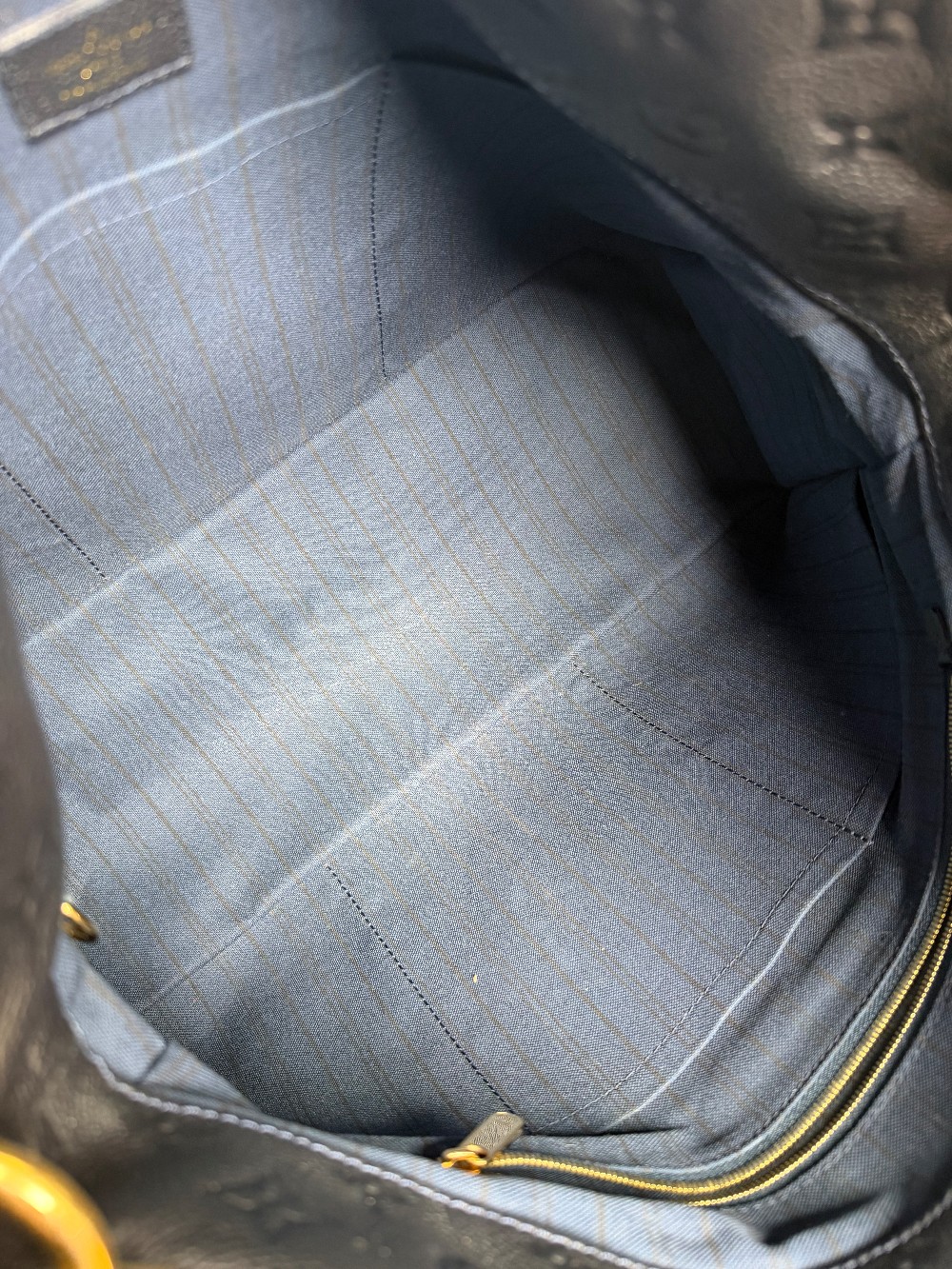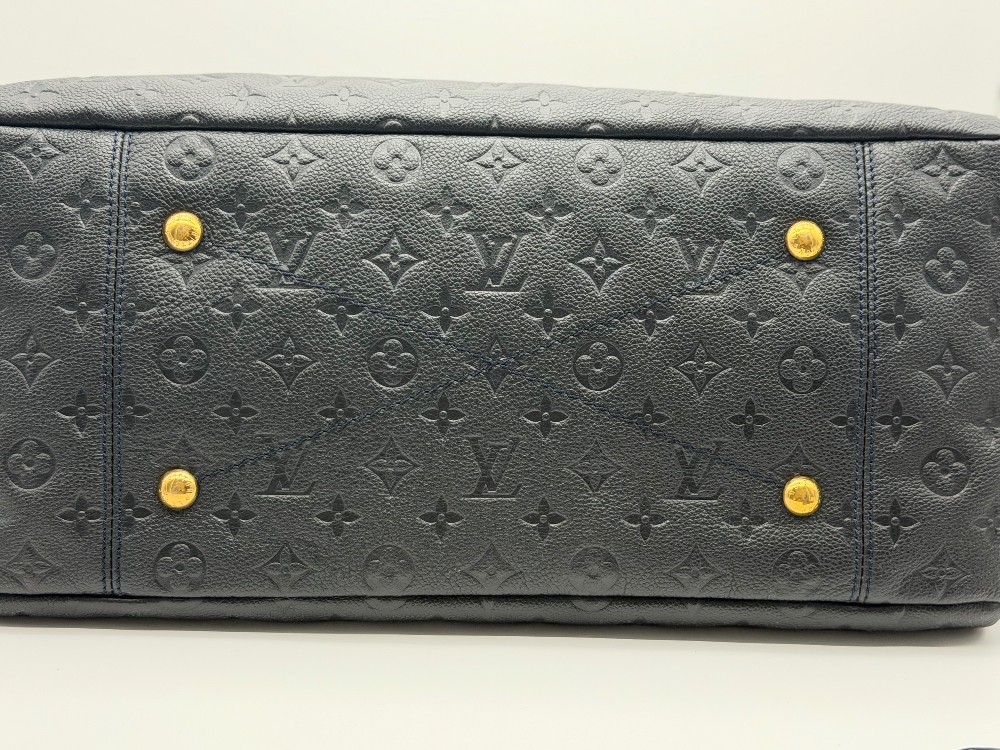 This is an authentic LOUIS VUITTON Empreinte Artsy MM Infini. This shoulder bag is crafted of navy blue monogram-embossed leather and gold hardware. The top opens to a blue striped fabric interior with a zipper pocket and patch pockets.