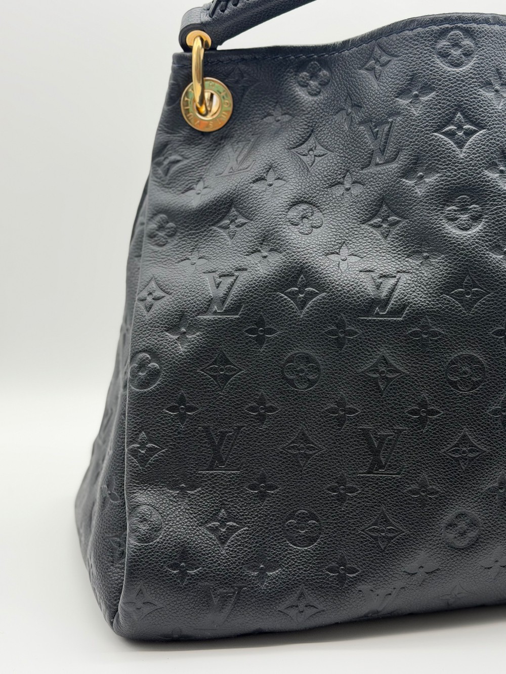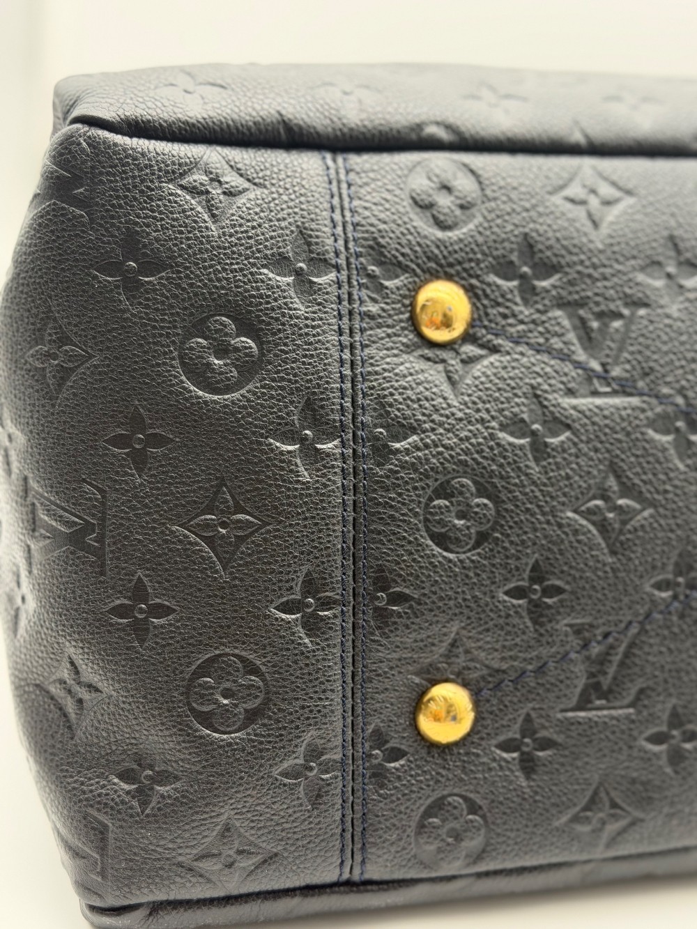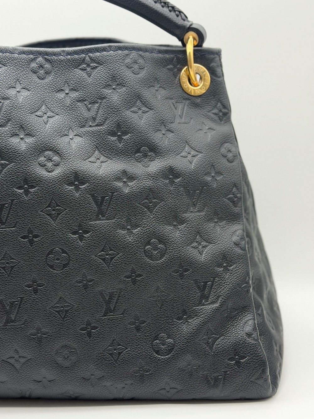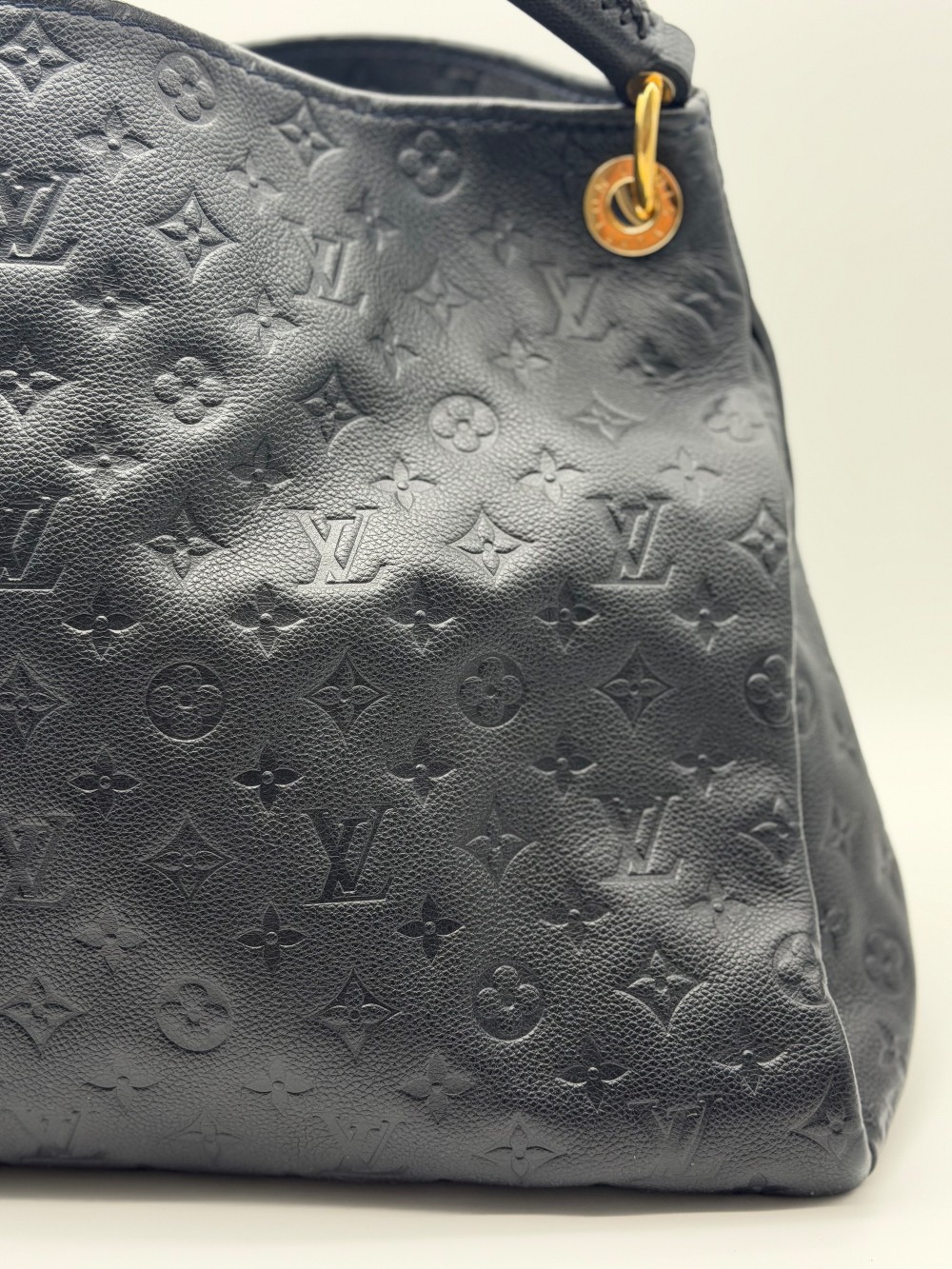 This is an authentic LOUIS VUITTON Empreinte Artsy MM Infini. This shoulder bag is crafted of navy blue monogram-embossed leather and gold hardware. The top opens to a blue striped fabric interior with a zipper pocket and patch pockets.