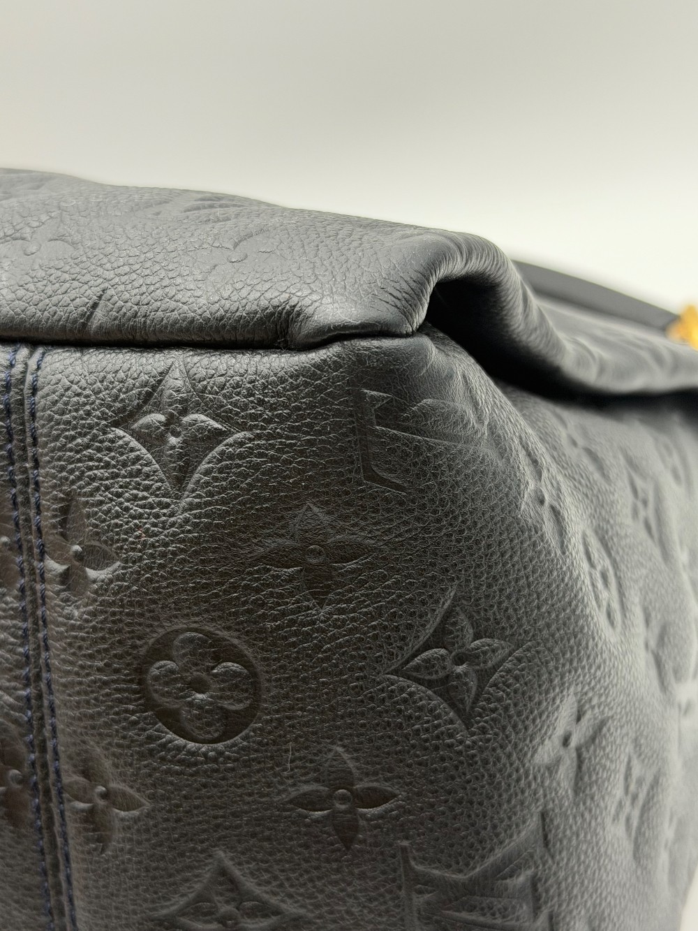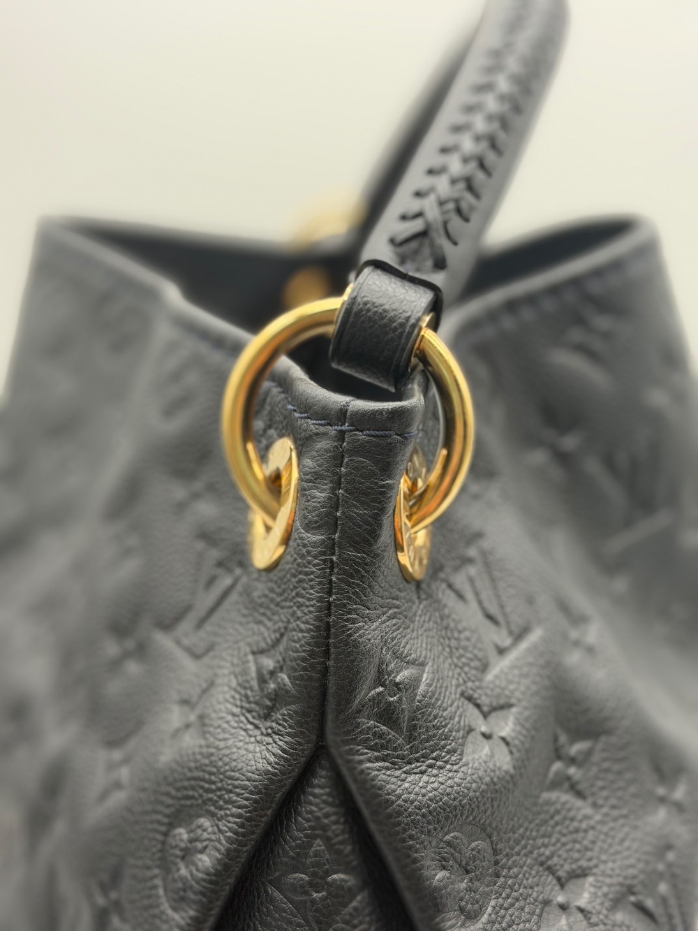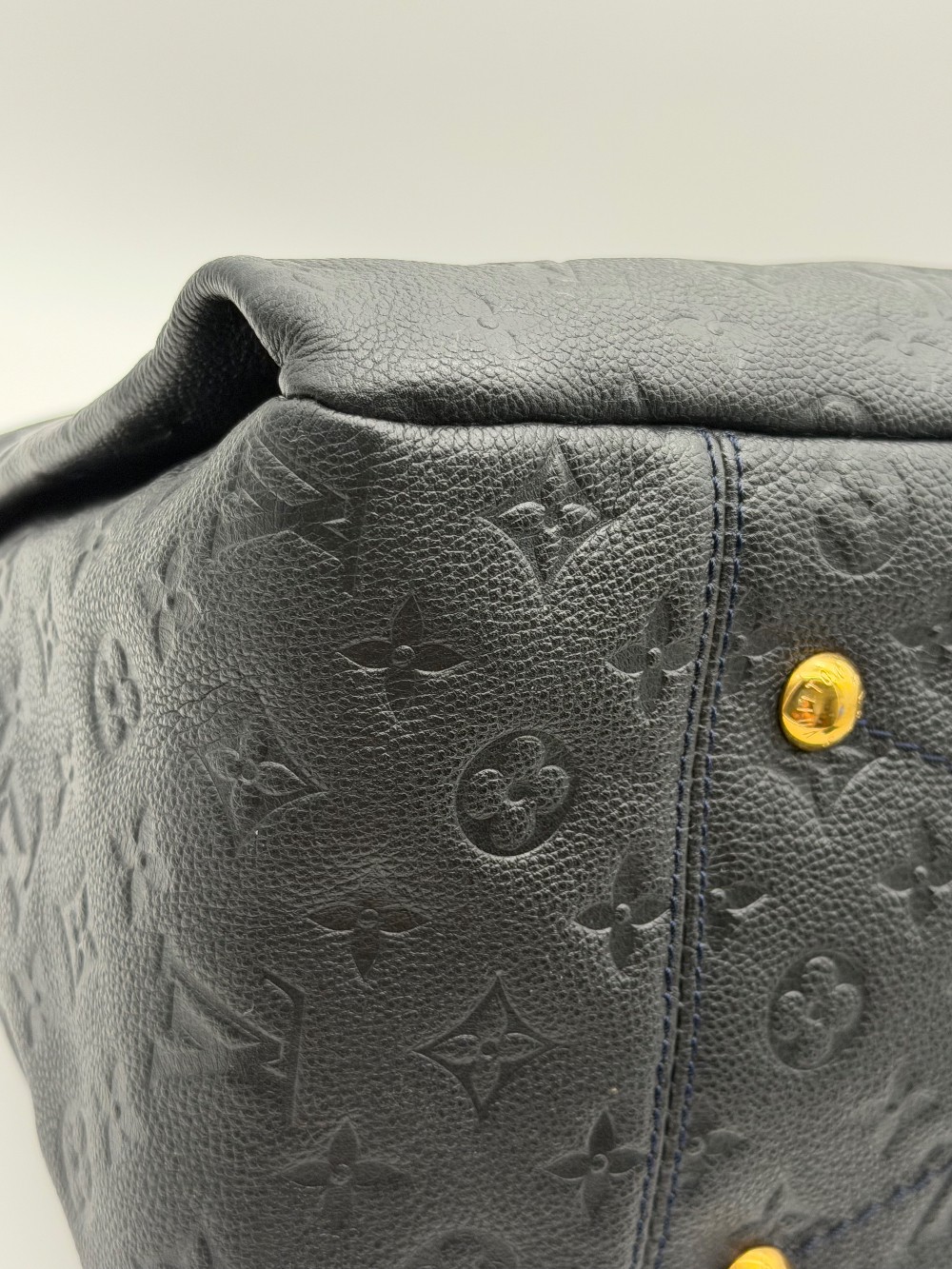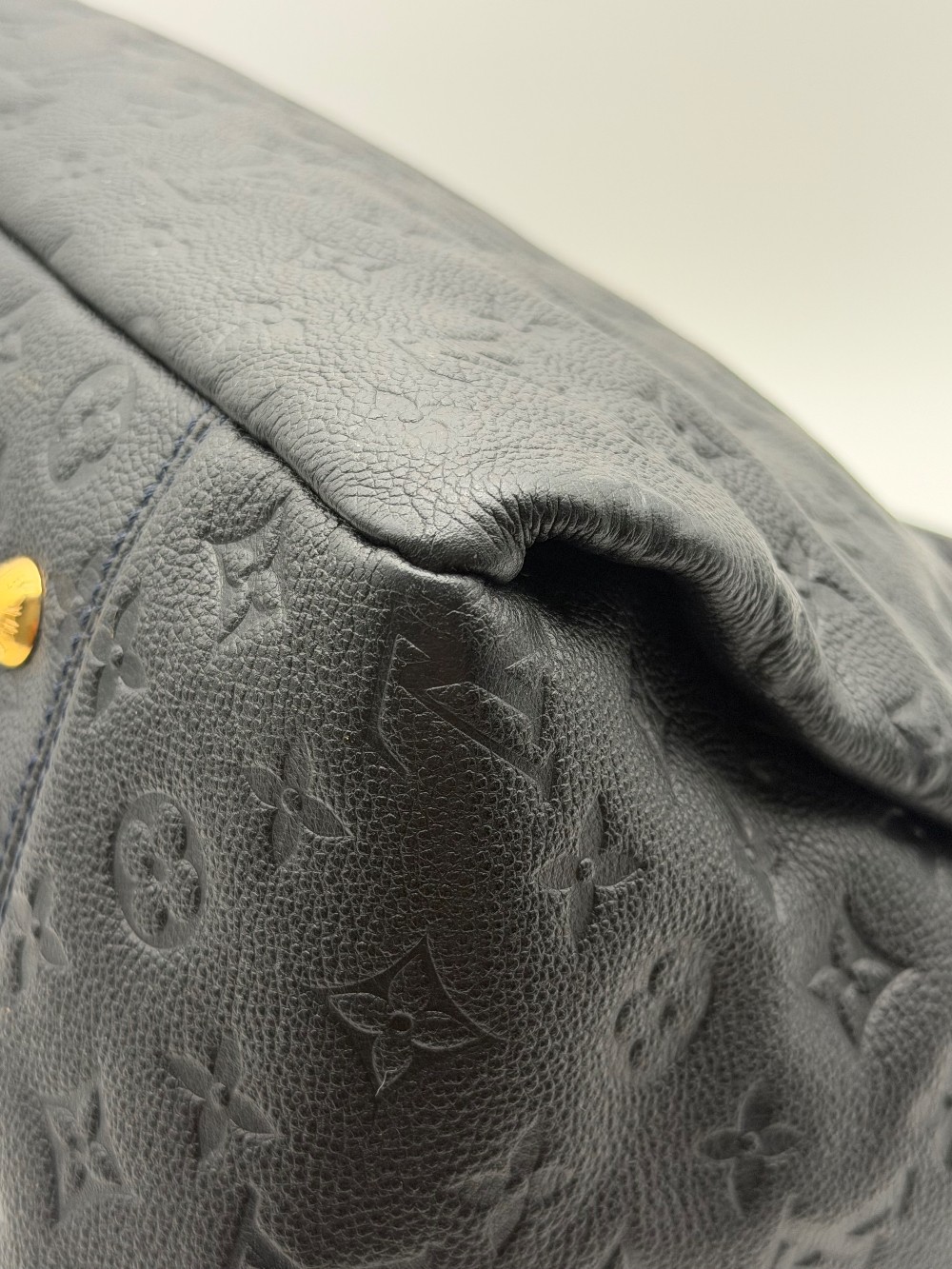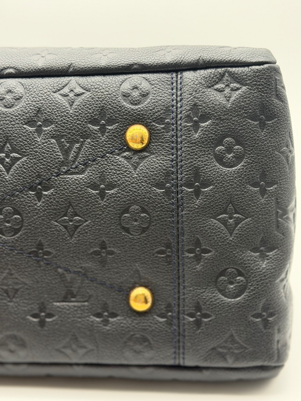 This is an authentic LOUIS VUITTON Empreinte Artsy MM Infini. This shoulder bag is crafted of navy blue monogram-embossed leather and gold hardware. The top opens to a blue striped fabric interior with a zipper pocket and patch pockets.