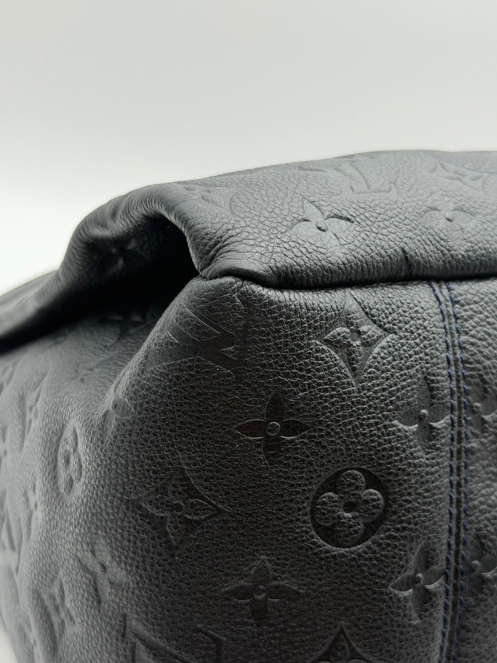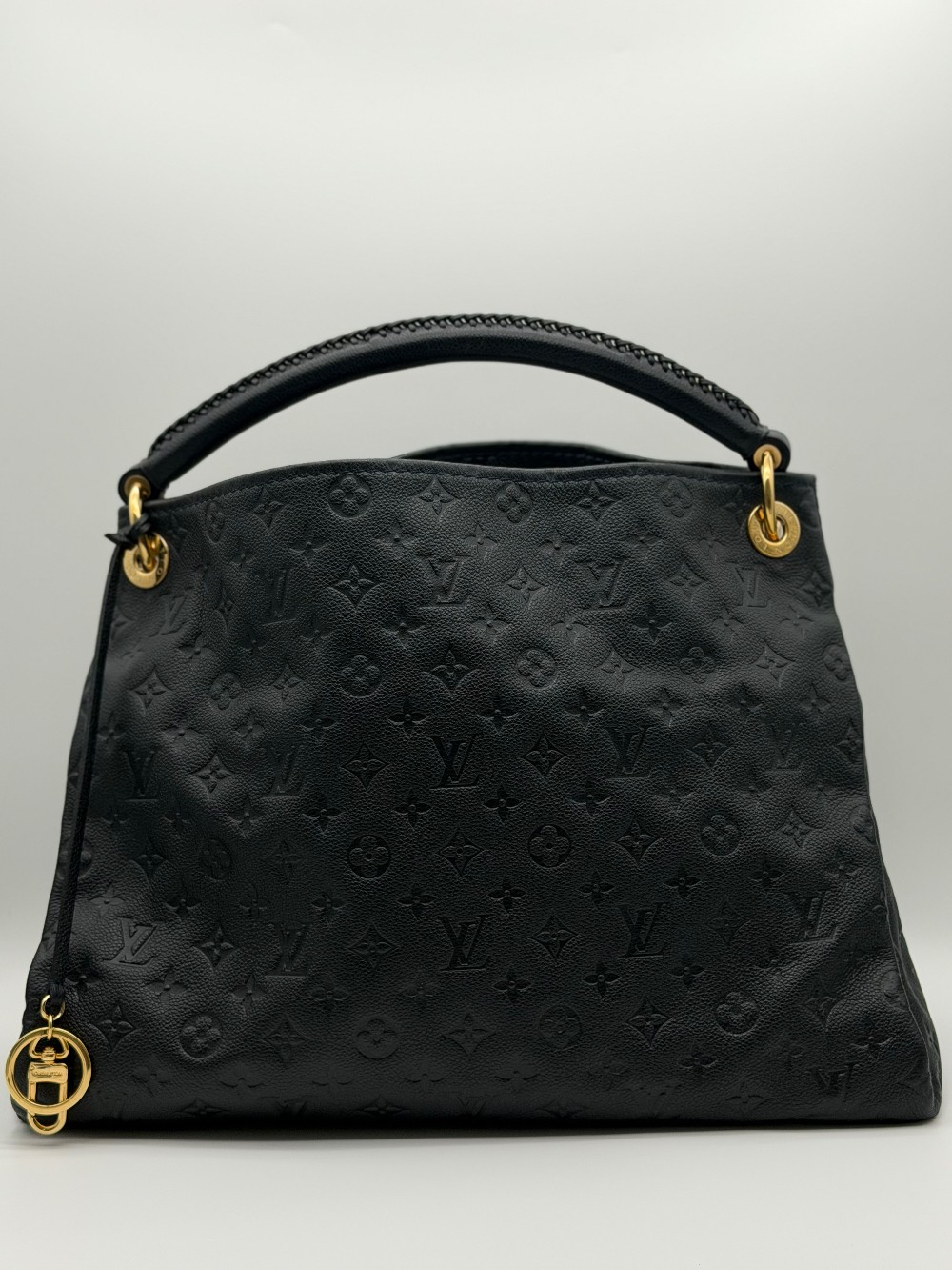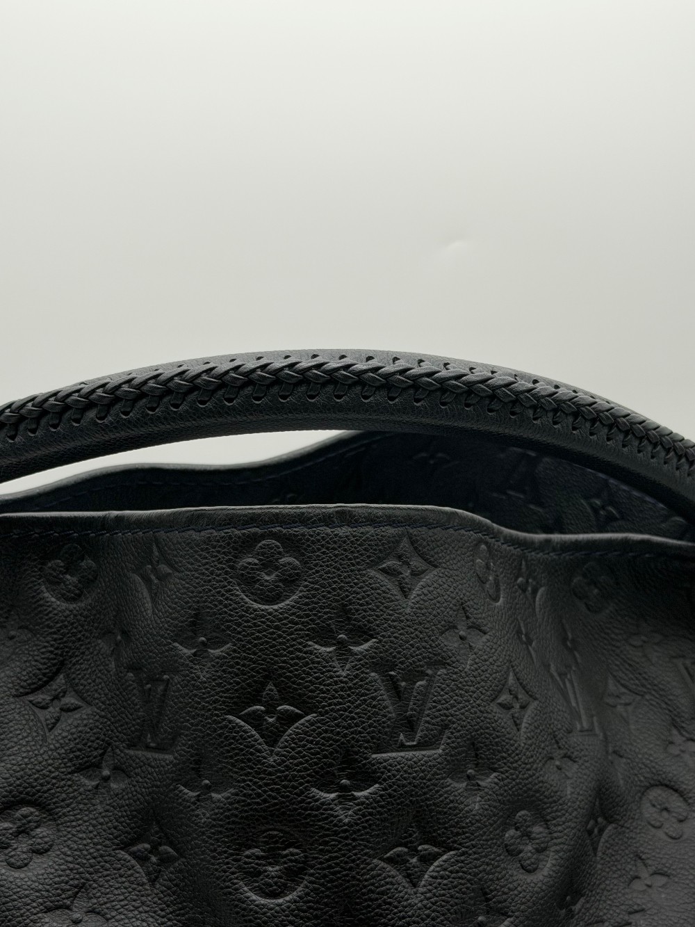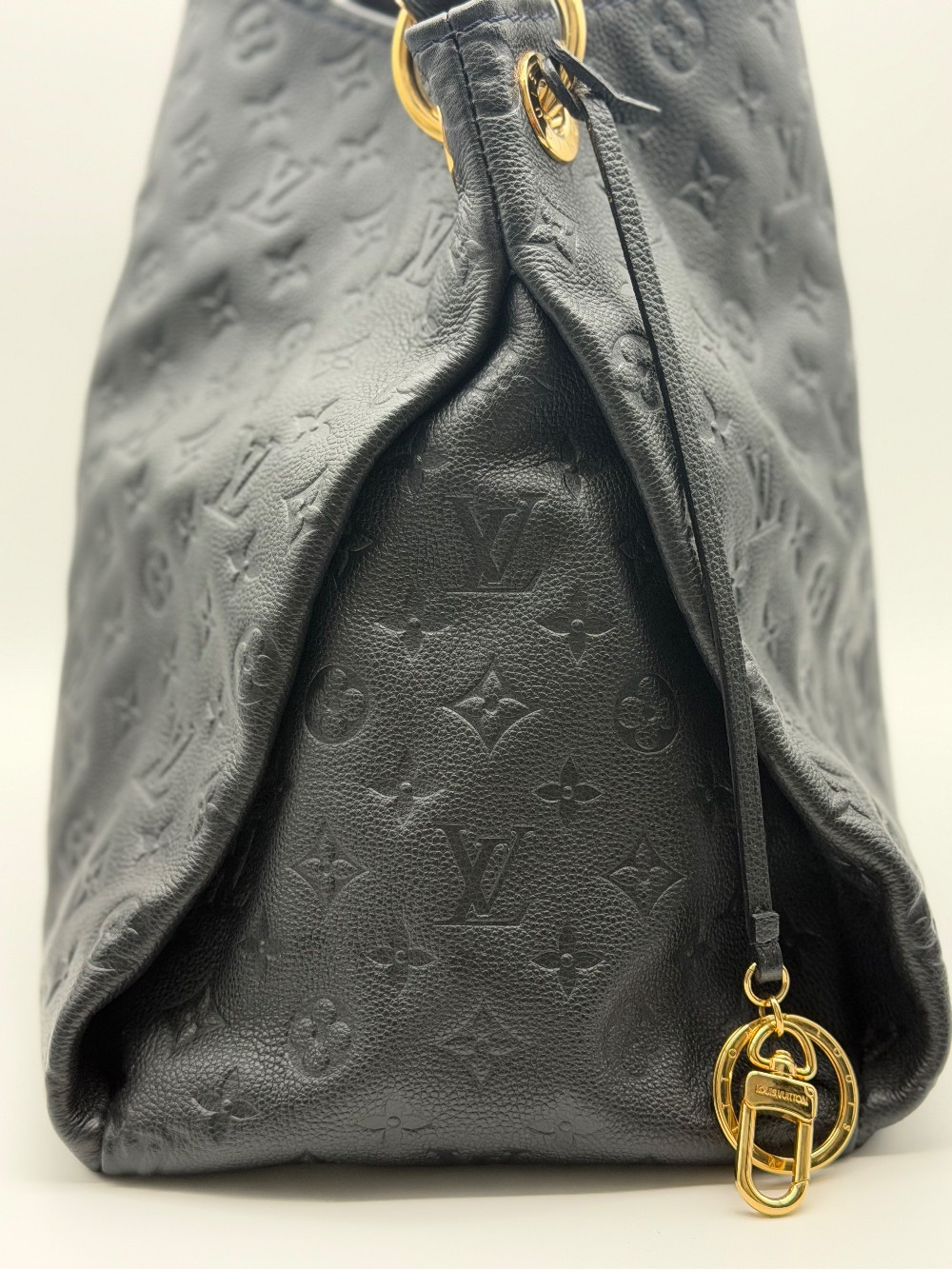 This is an authentic LOUIS VUITTON Empreinte Artsy MM Infini. This shoulder bag is crafted of navy blue monogram-embossed leather and gold hardware. The top opens to a blue striped fabric interior with a zipper pocket and patch pockets.