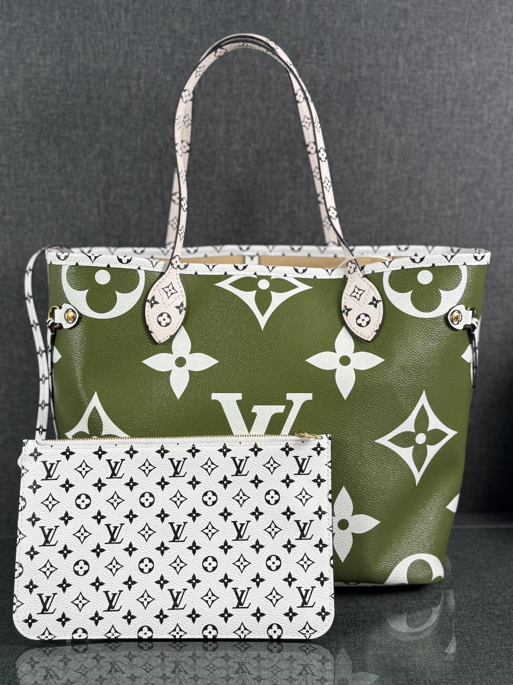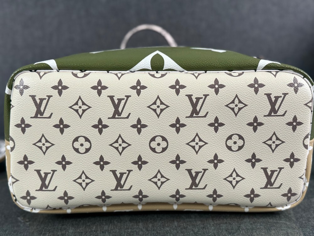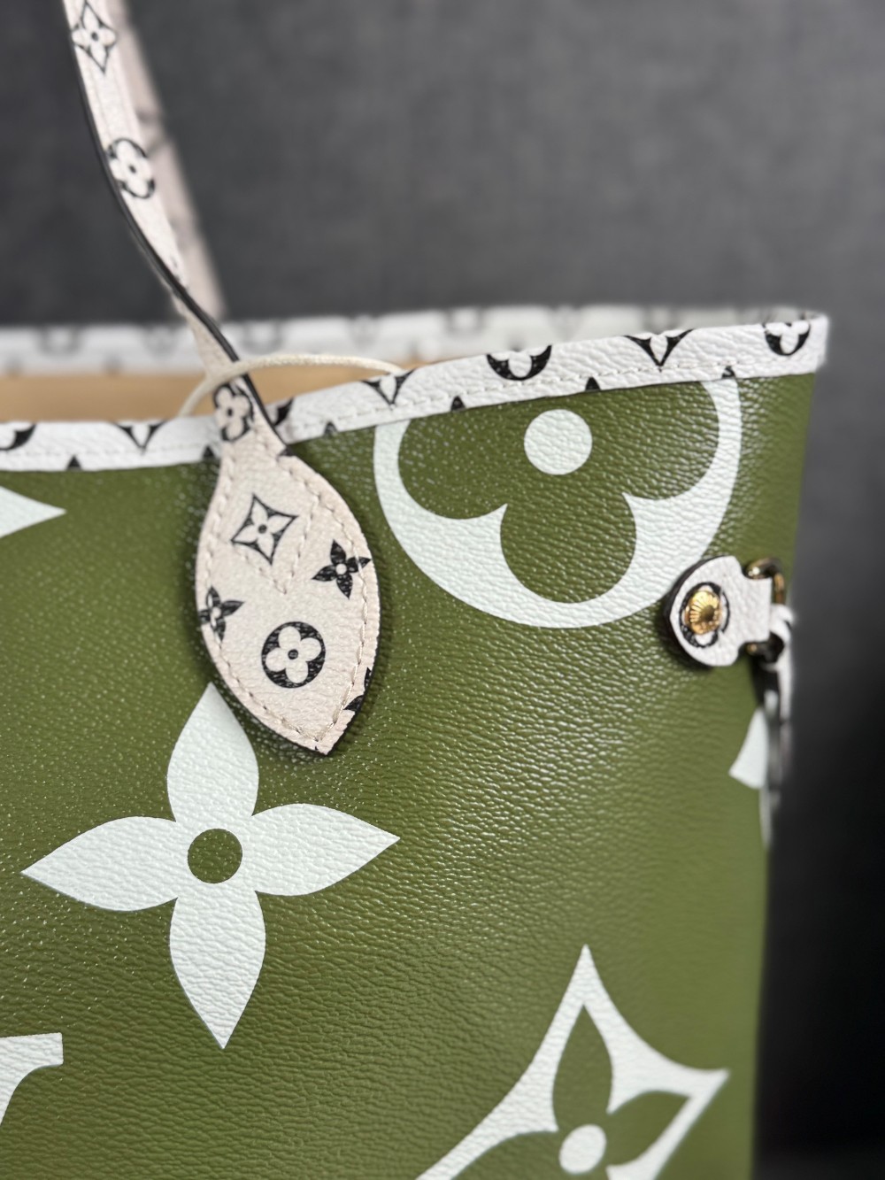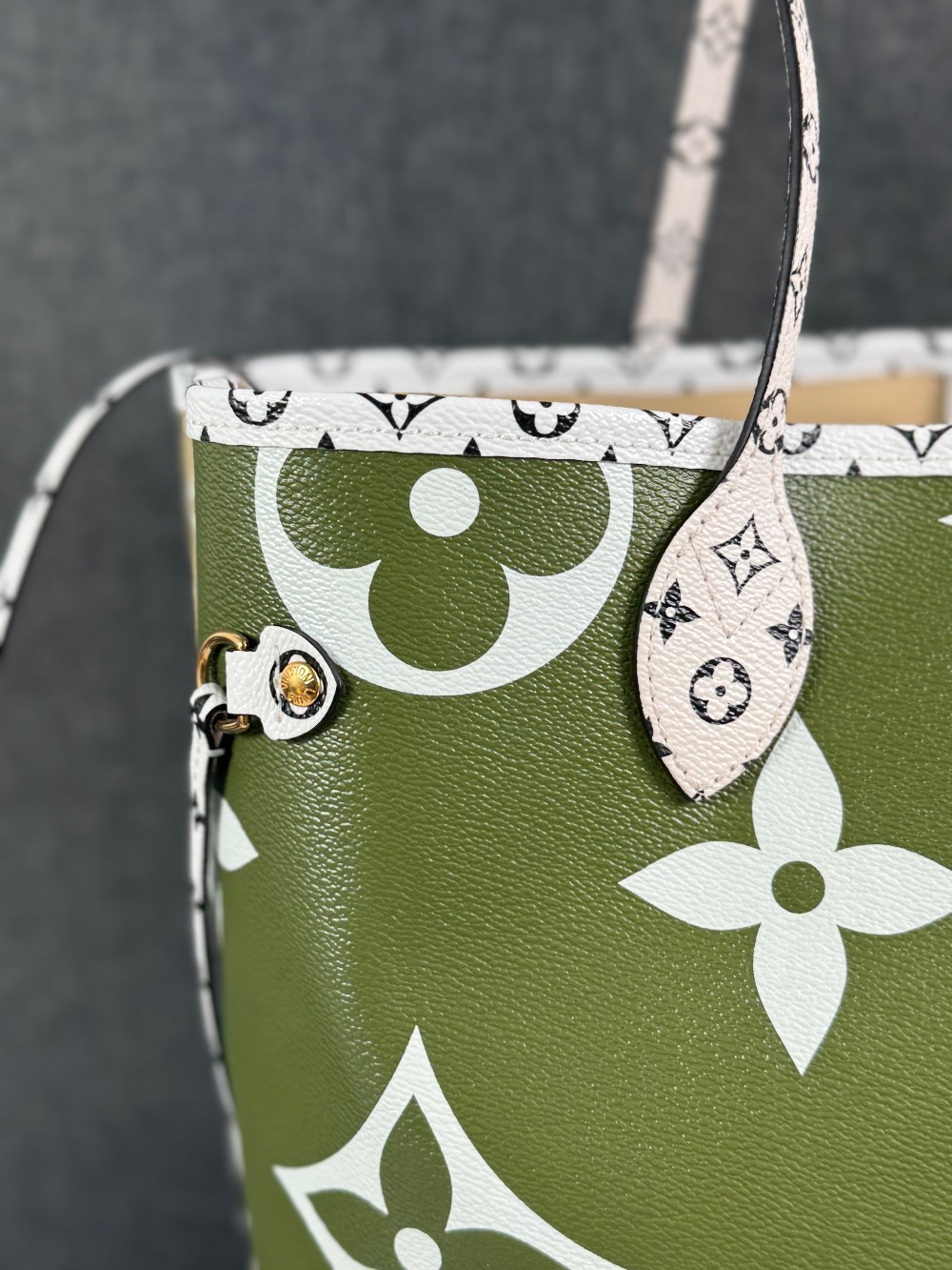This is an authentic LOUIS VUITTON Monogram Giant Neverfull MM in Kaki. This tote features both oversized and miniature versions of classic Louis Vuitton monogram in white on green and beige coated canvas. The bag features black and white monogram printed shoulder straps, and matching side cinches. The top is open to a spacious beige fabric interior with a hanging zipper pocket and a removable black and white monogram printed pochette. This is a gorgeous tote with an exceptional look for a day of play, from Louis Vuitton!
