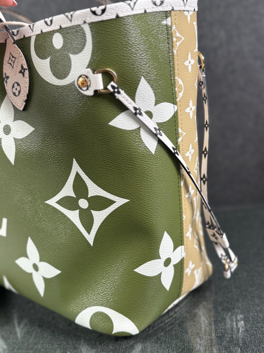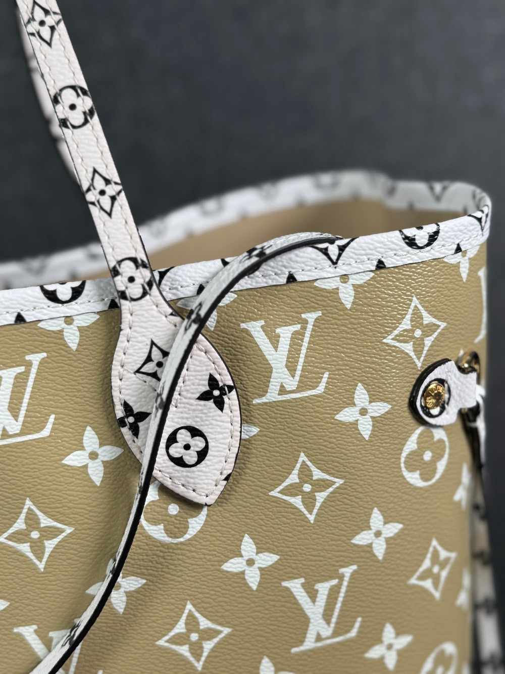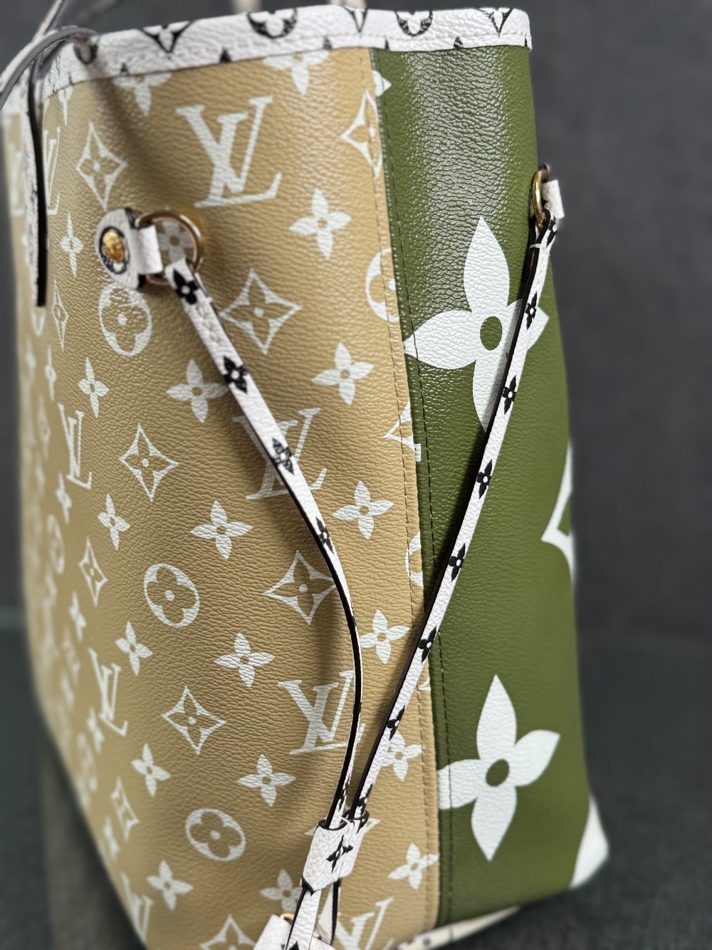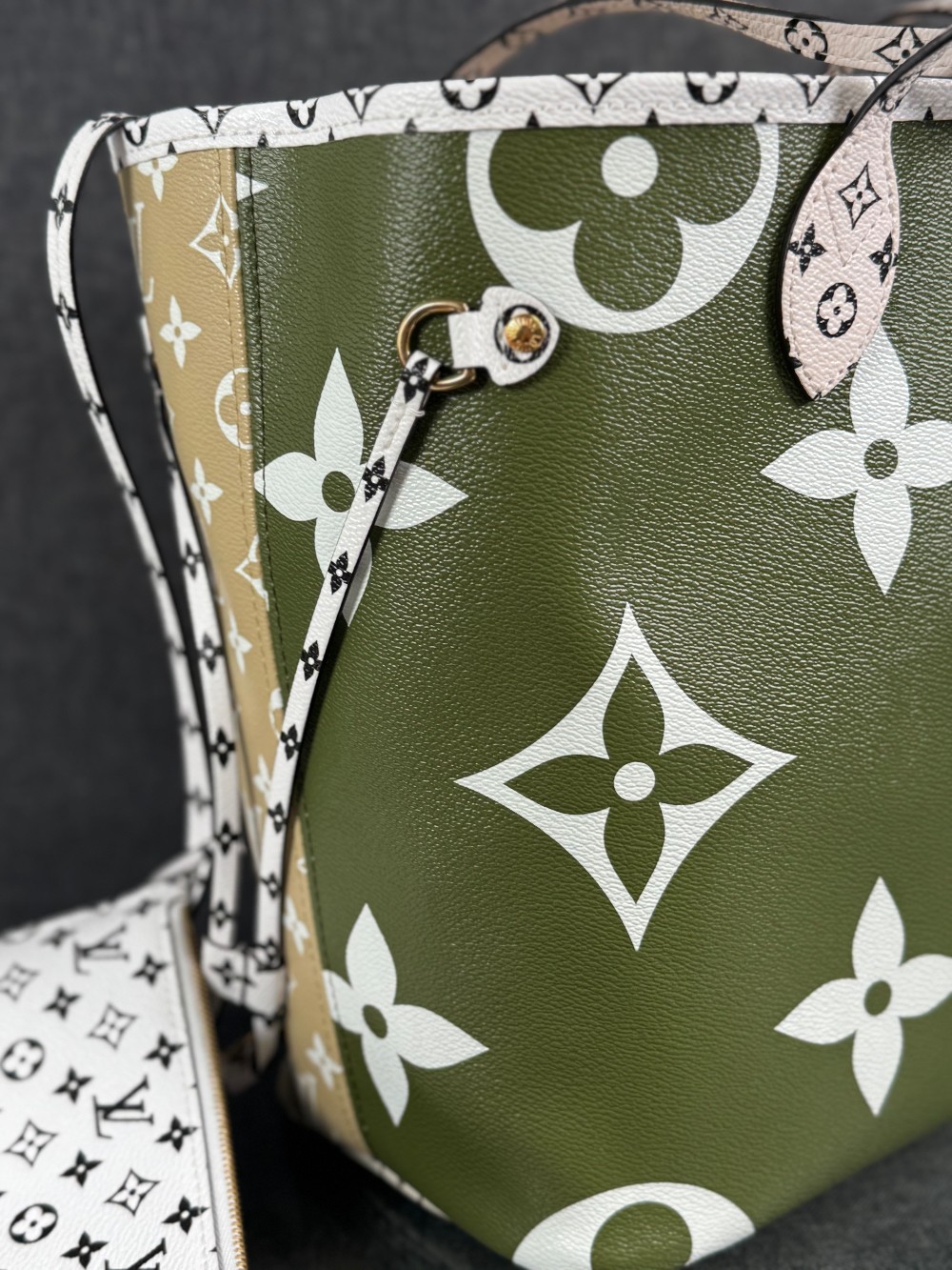 This is an authentic LOUIS VUITTON Monogram Giant Neverfull MM in Kaki. This tote features both oversized and miniature versions of classic Louis Vuitton monogram in white on green and beige coated canvas. The bag features black and white monogram printed shoulder straps, and matching side cinches. The top is open to a spacious beige fabric interior with a hanging zipper pocket and a removable black and white monogram printed pochette. This is a gorgeous tote with an exceptional look for a day of play, from Louis Vuitton!