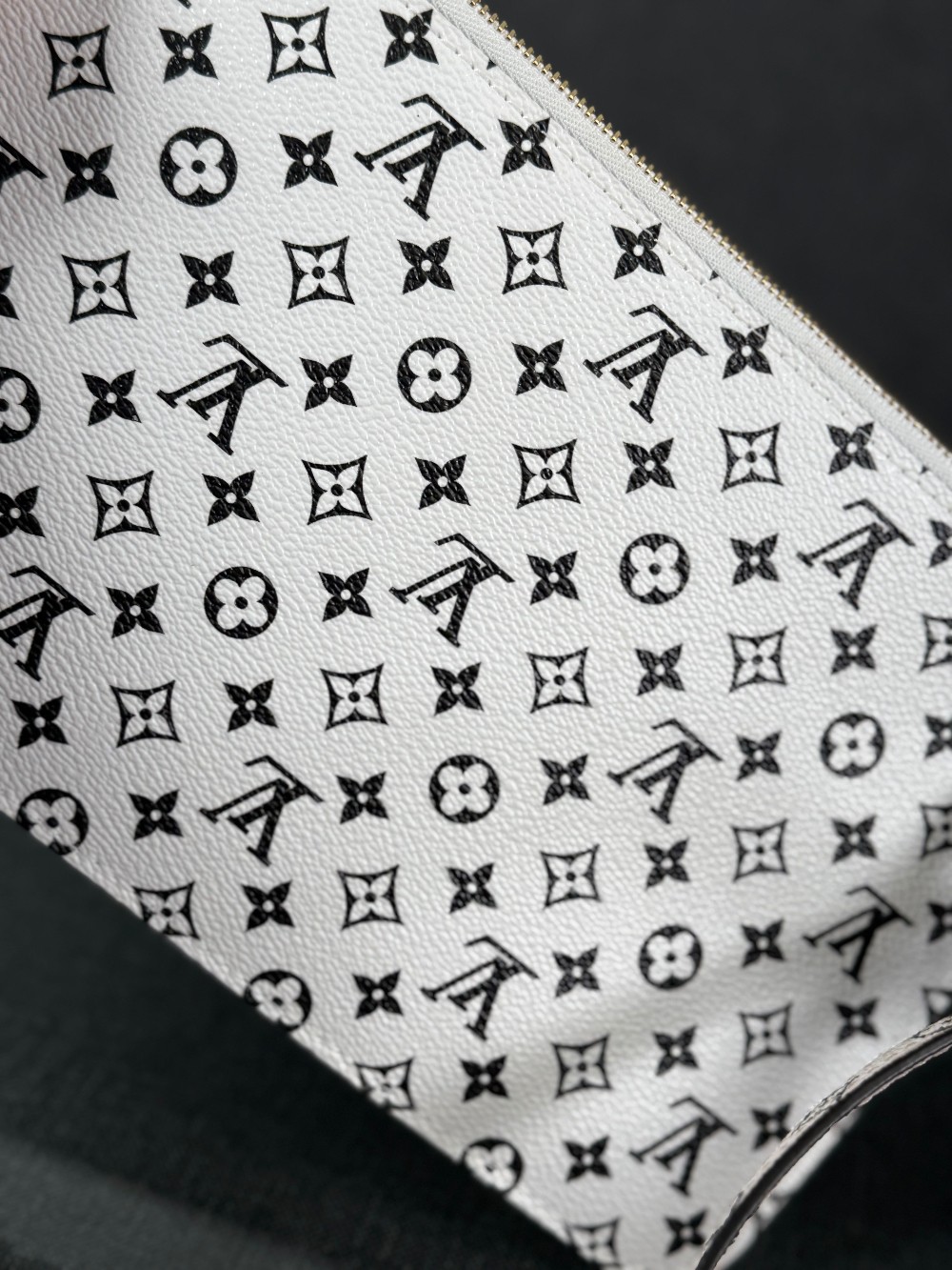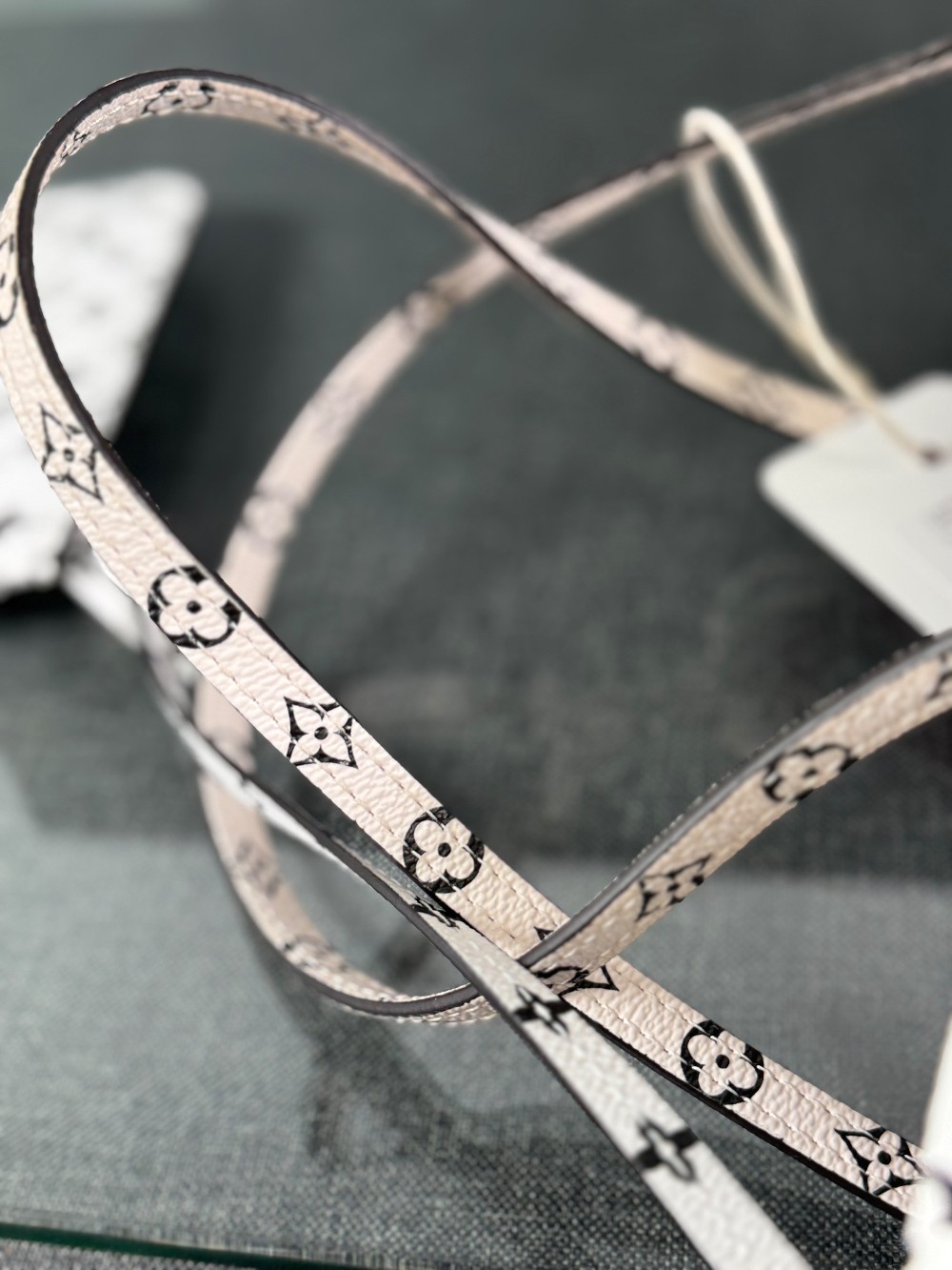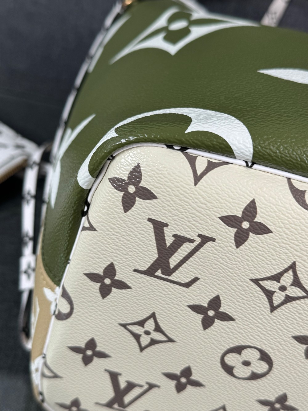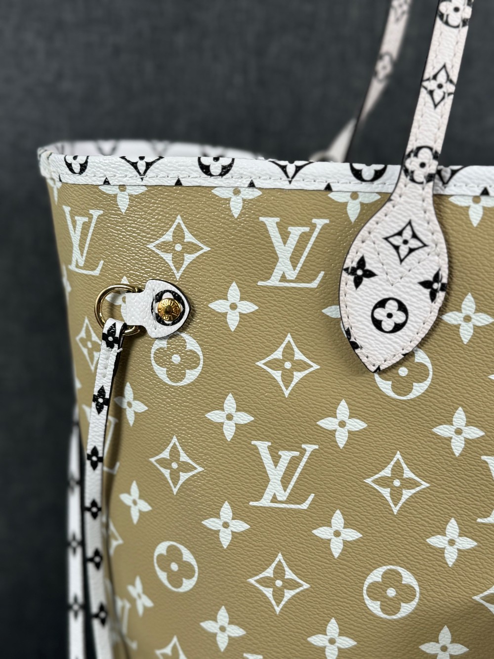 This is an authentic LOUIS VUITTON Monogram Giant Neverfull MM in Kaki. This tote features both oversized and miniature versions of classic Louis Vuitton monogram in white on green and beige coated canvas. The bag features black and white monogram printed shoulder straps, and matching side cinches. The top is open to a spacious beige fabric interior with a hanging zipper pocket and a removable black and white monogram printed pochette. This is a gorgeous tote with an exceptional look for a day of play, from Louis Vuitton!