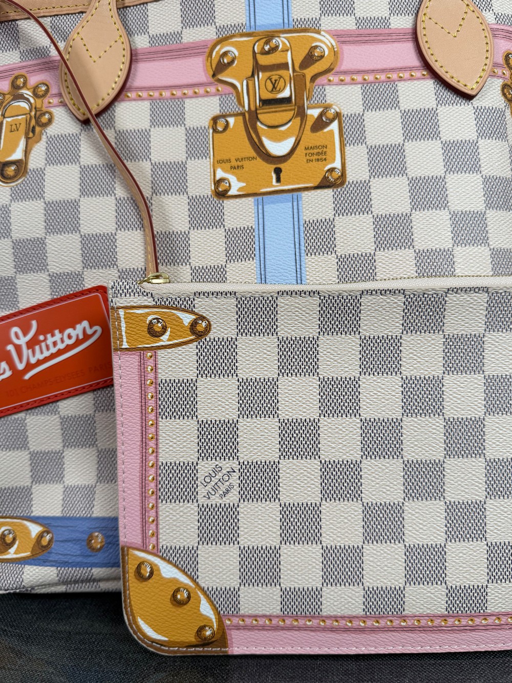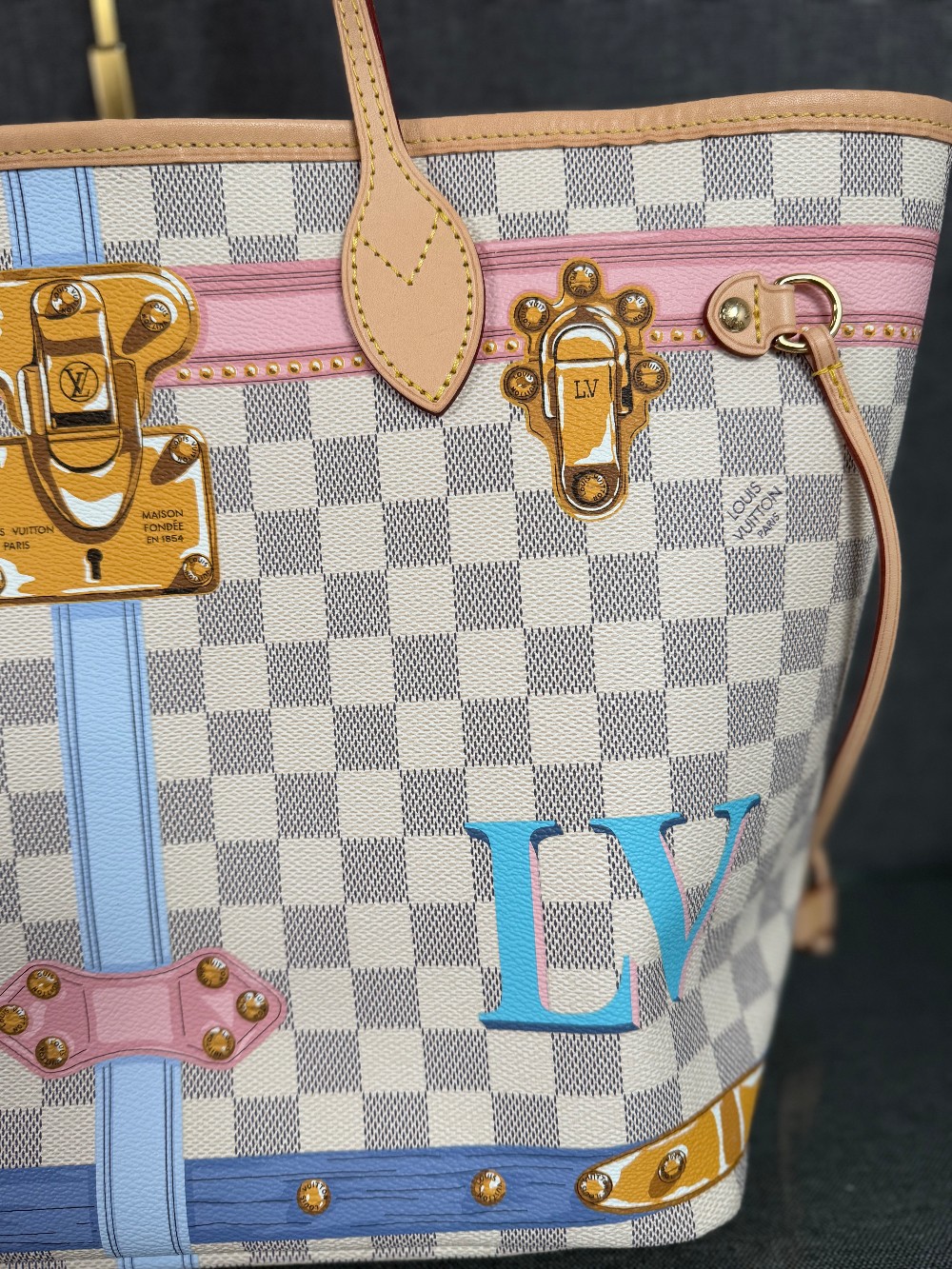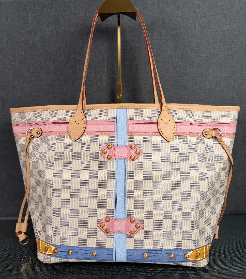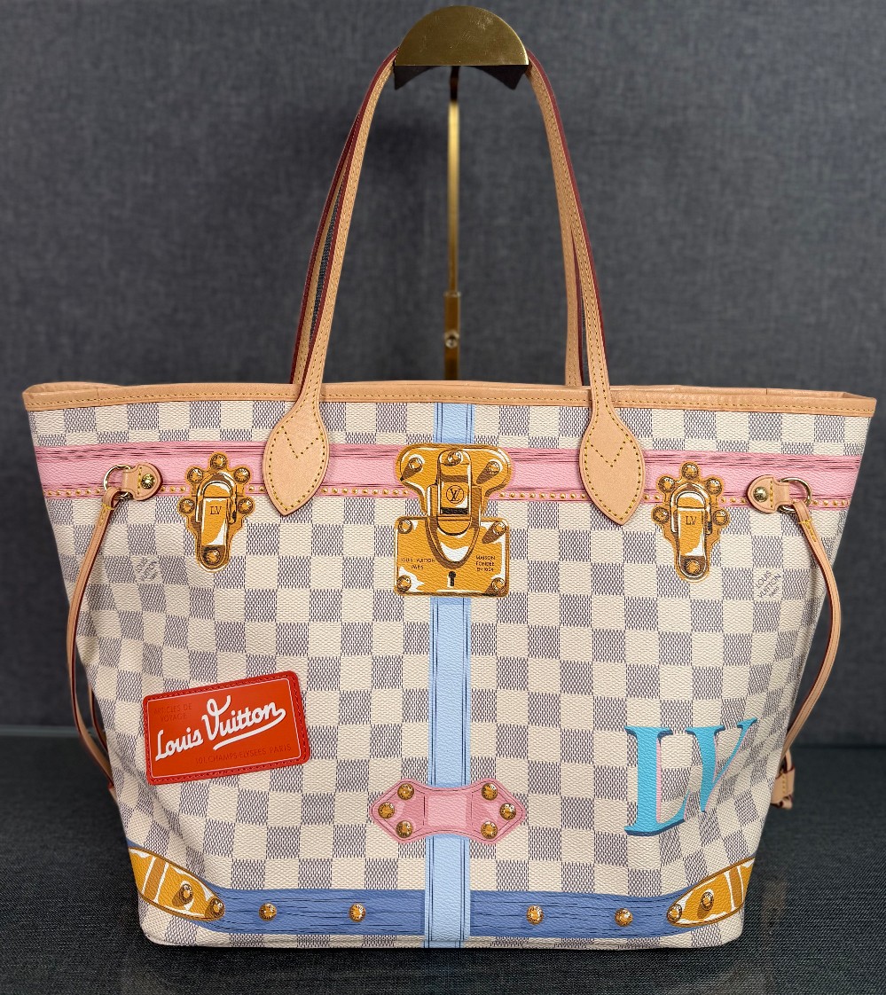 This authentic bag in the image is a limited edition Louis Vuitton Neverfull tote from the 2018 "Summer Trunks" collection.