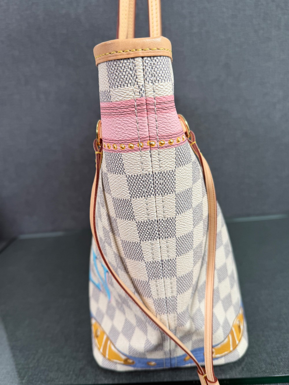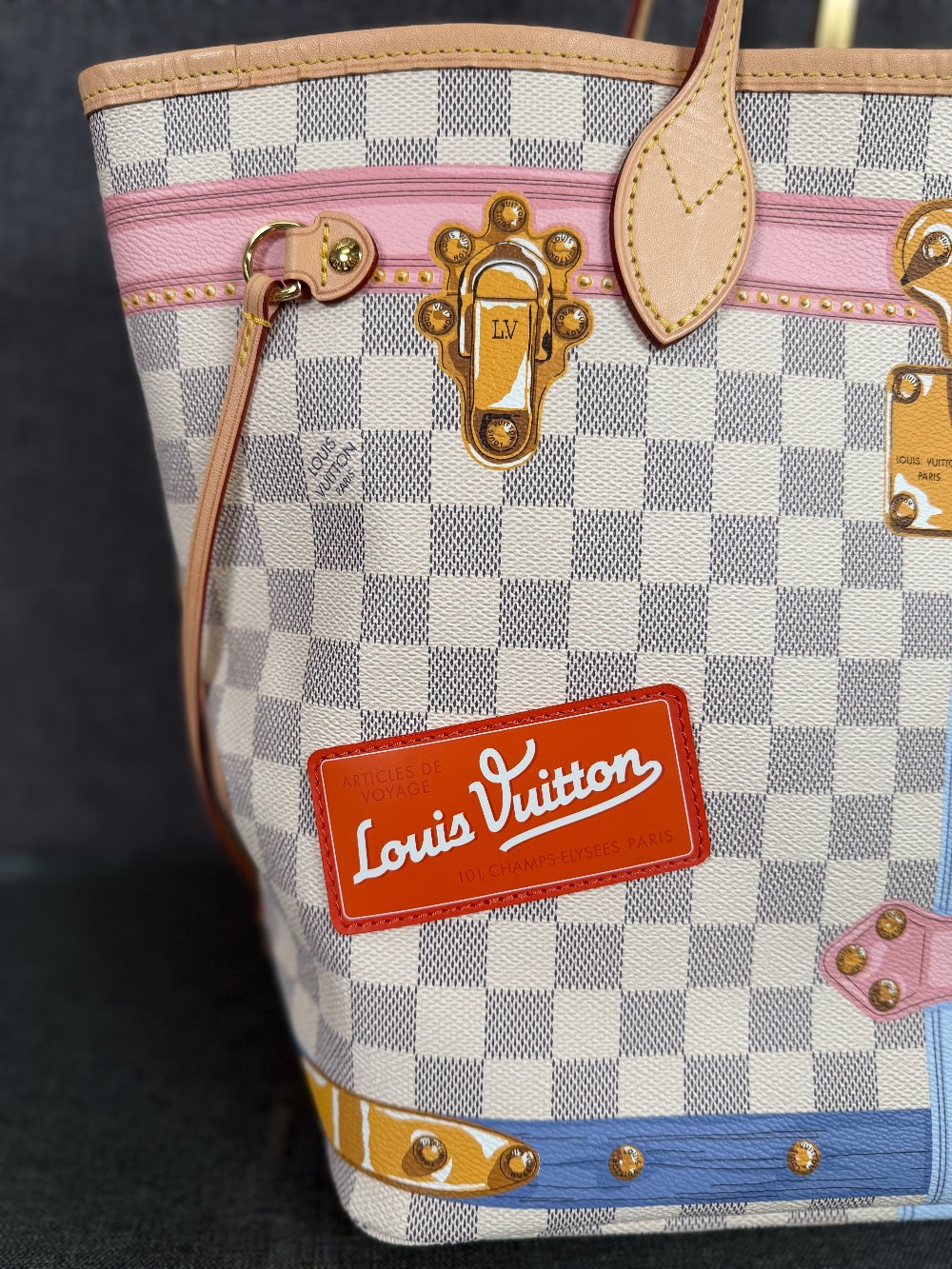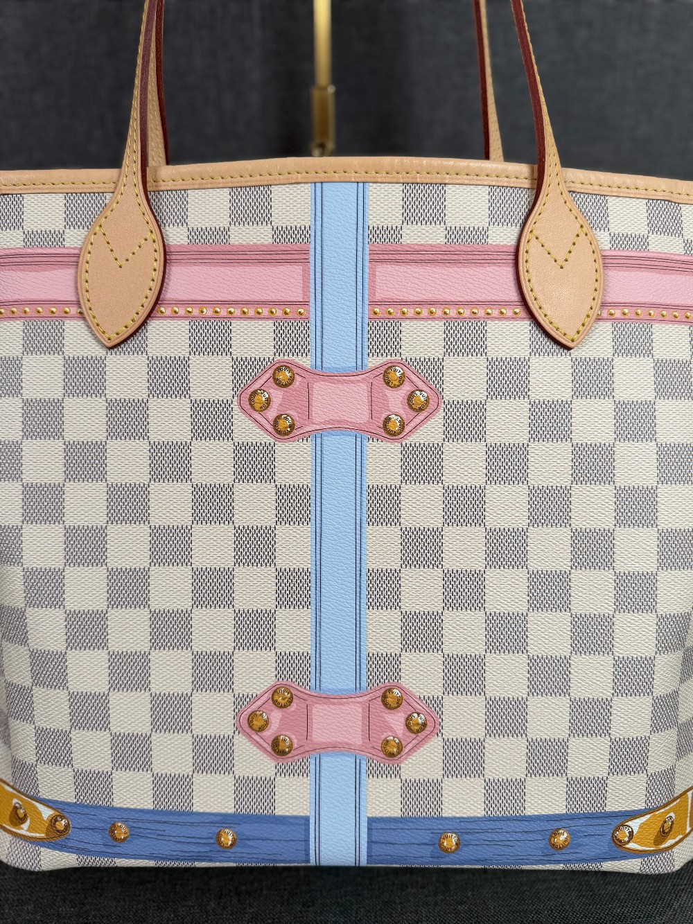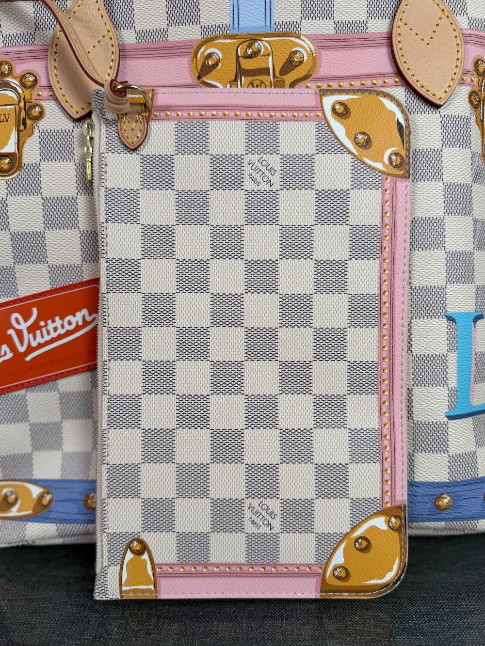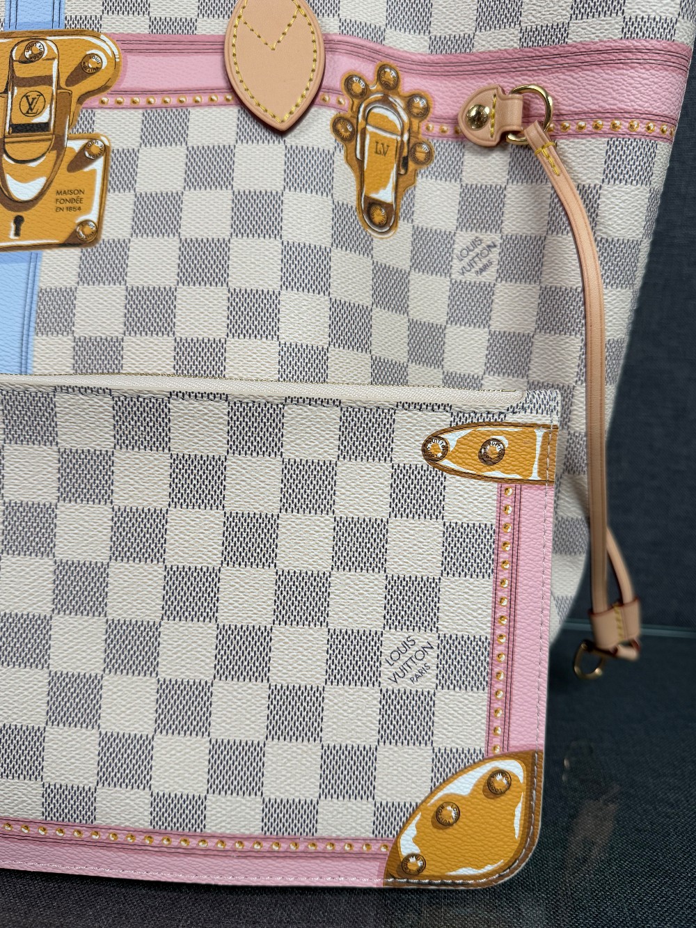 This authentic bag in the image is a limited edition Louis Vuitton Neverfull tote from the 2018 "Summer Trunks" collection.