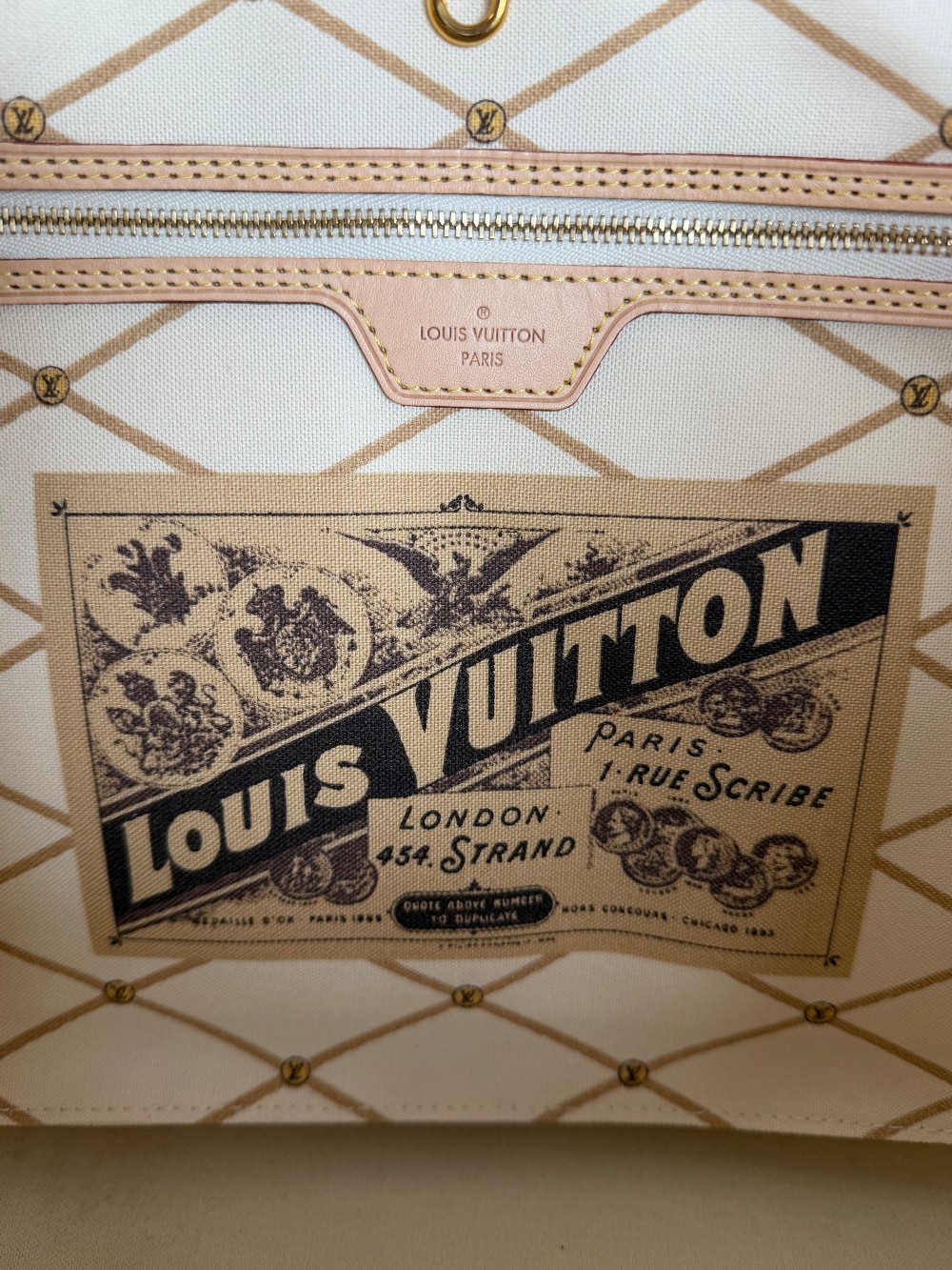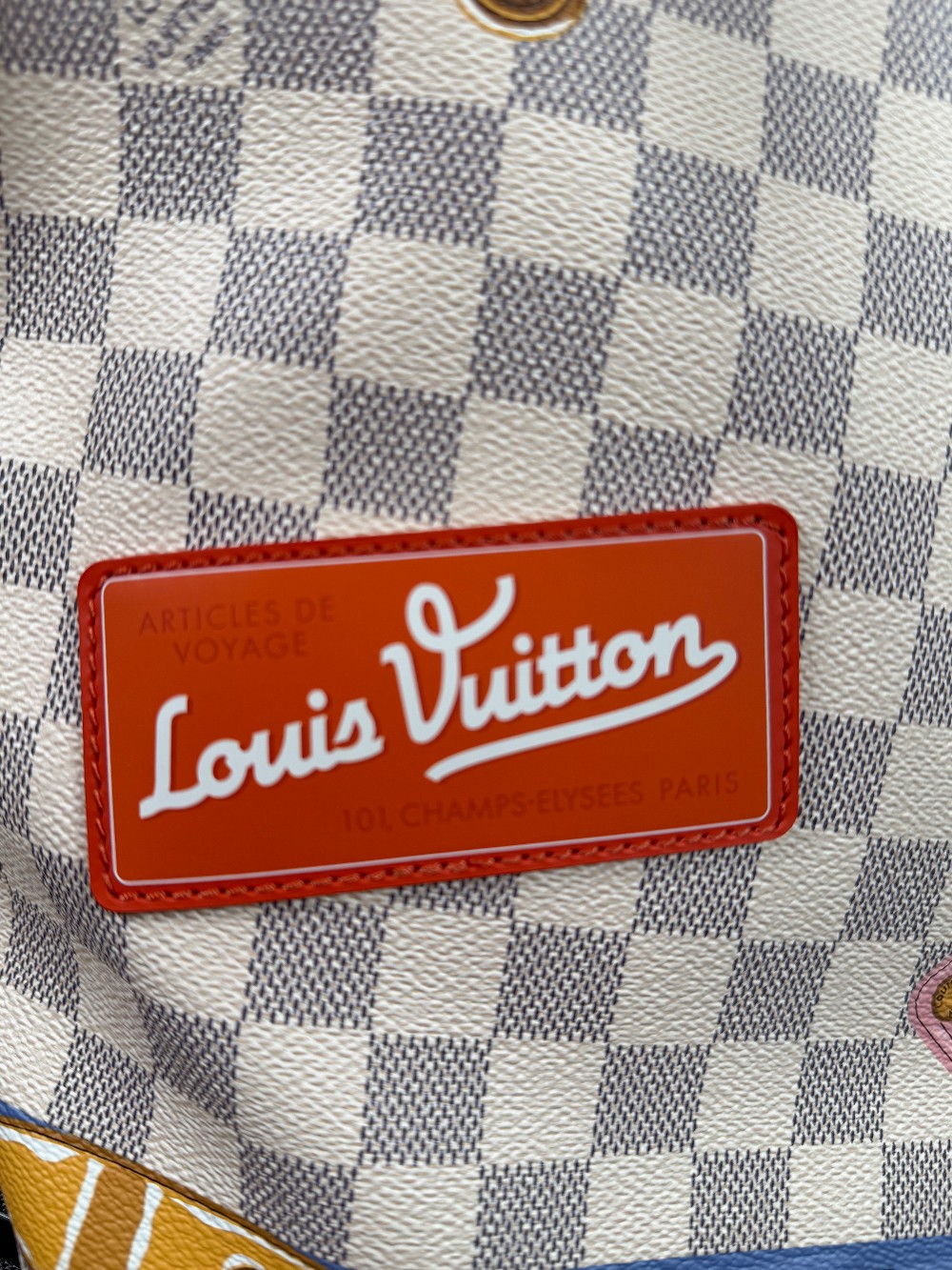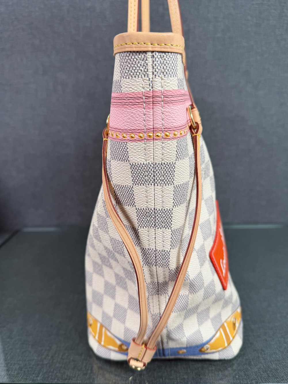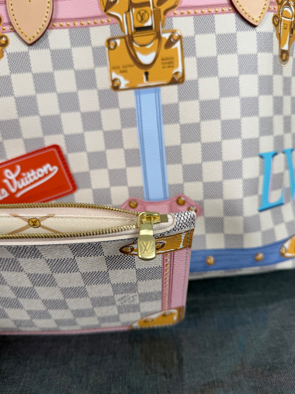 This authentic bag in the image is a limited edition Louis Vuitton Neverfull tote from the 2018 "Summer Trunks" collection.