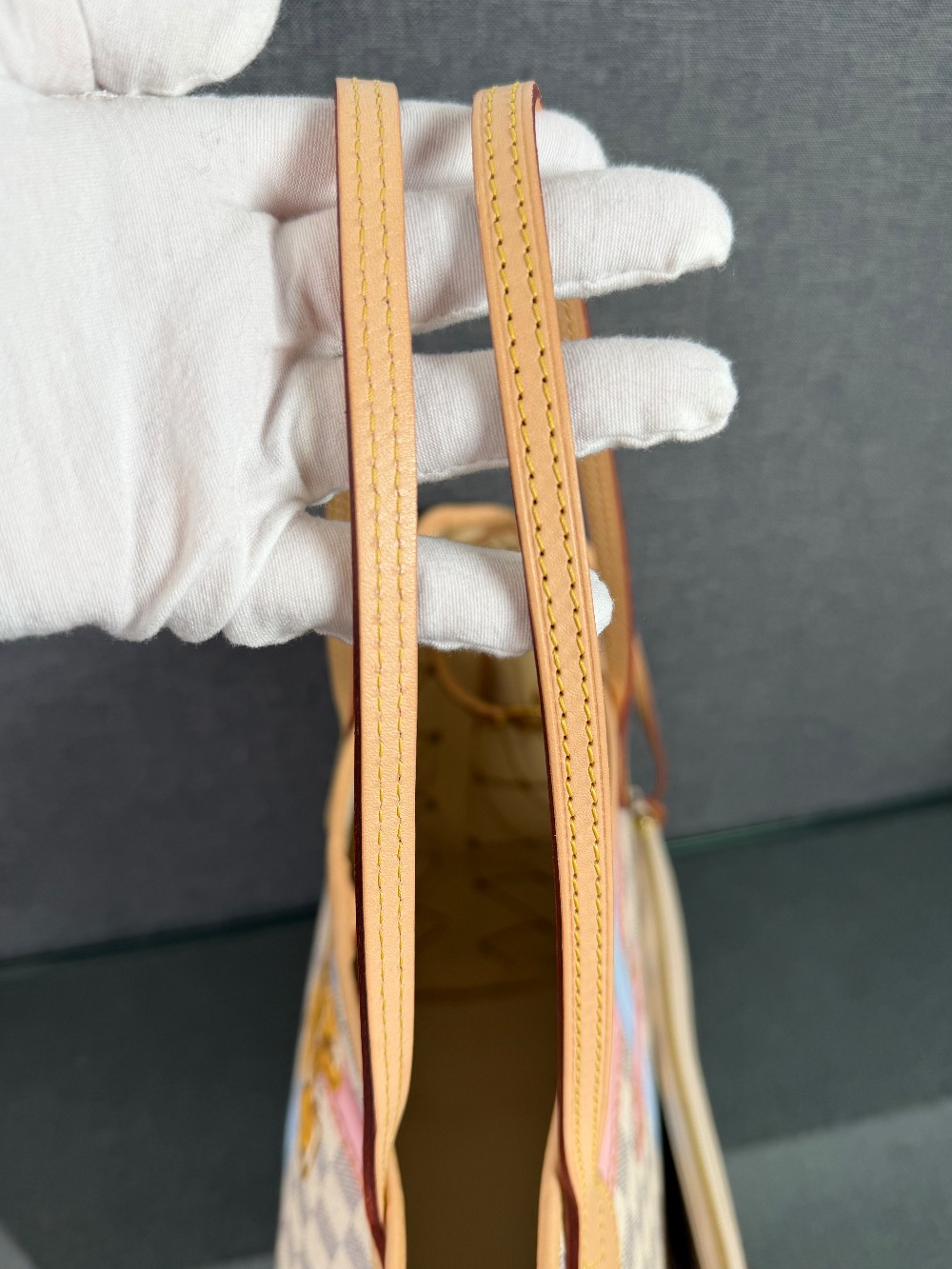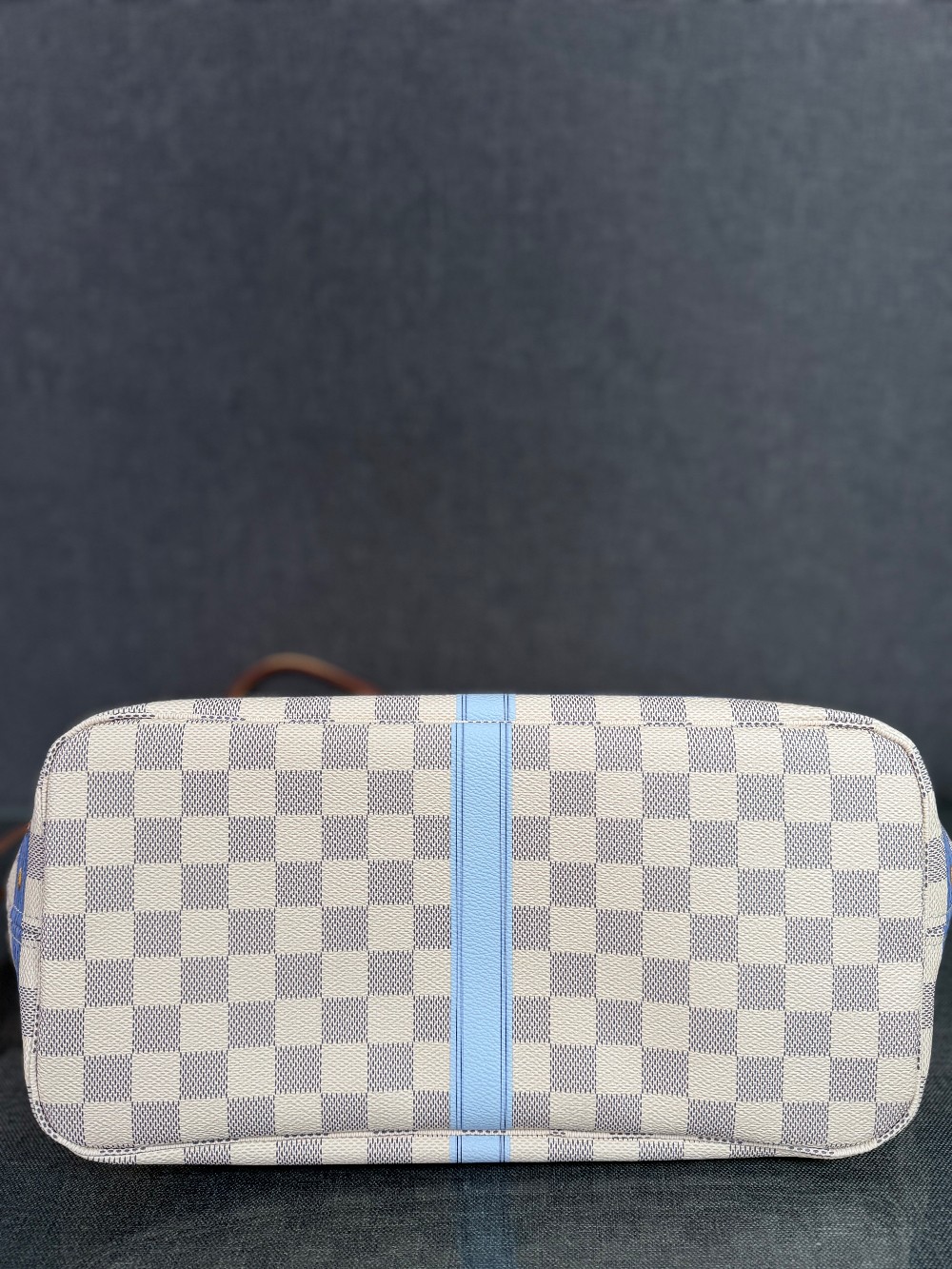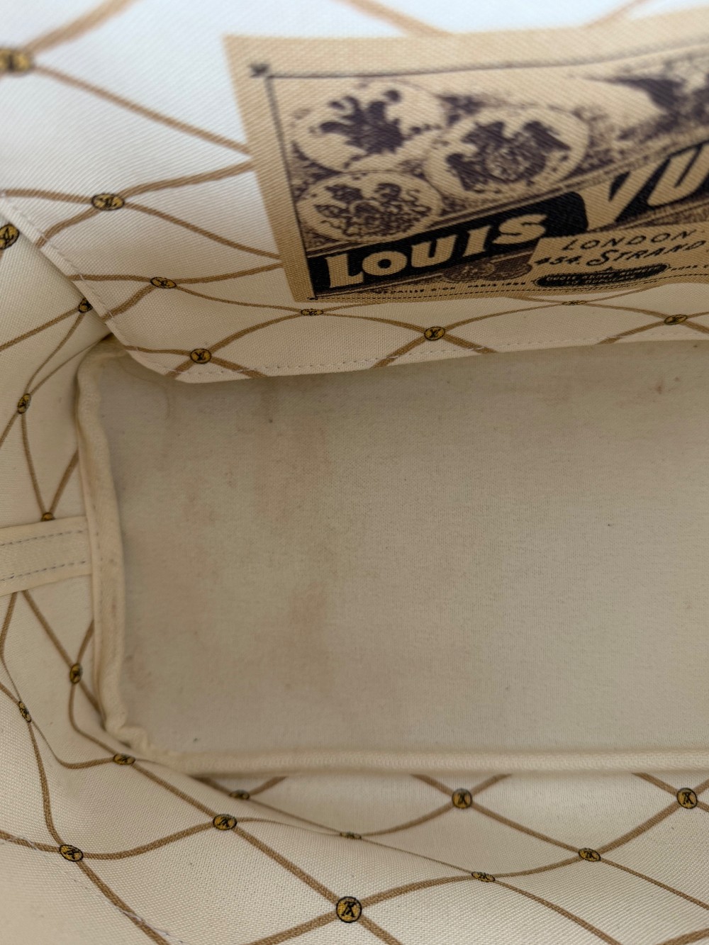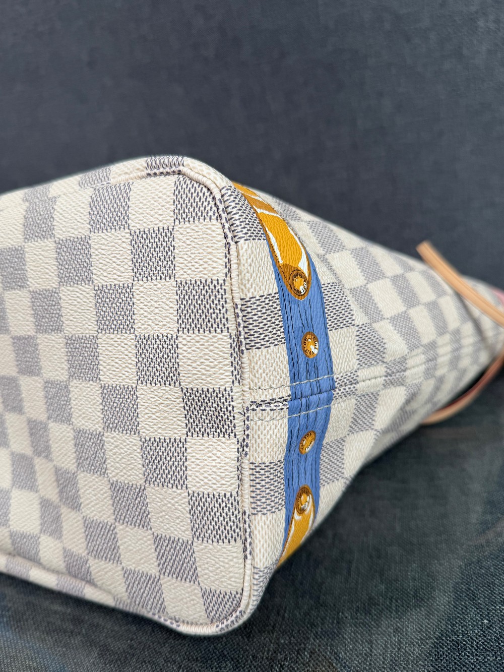 This authentic bag in the image is a limited edition Louis Vuitton Neverfull tote from the 2018 "Summer Trunks" collection.