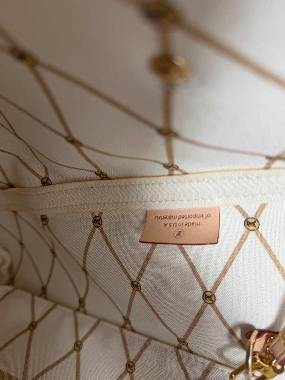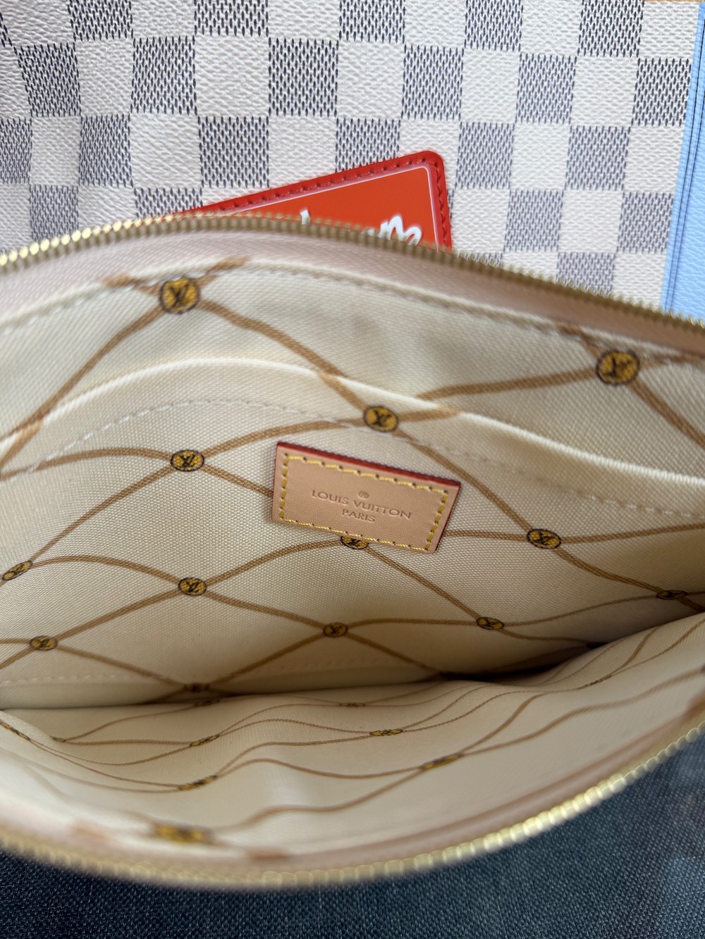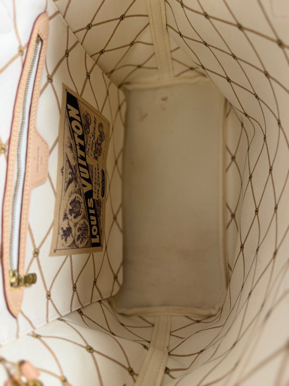 As a Neverfull, it is a versatile tote with side laces that can cinch the bag for a different look. It includes a matching removable zipped pouch, which can be used as a clutch or an extra pocket.