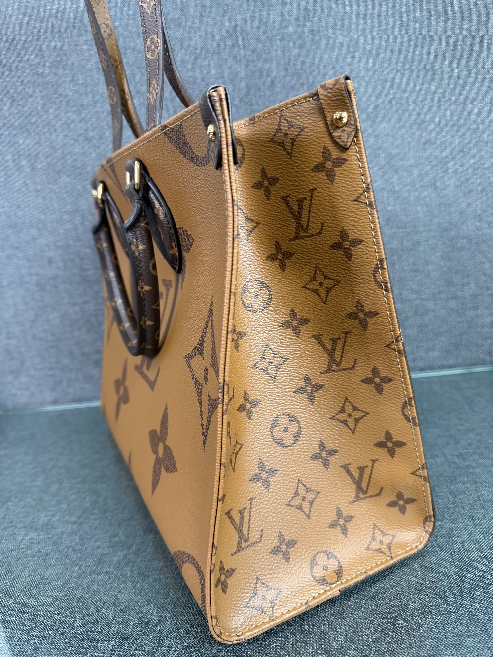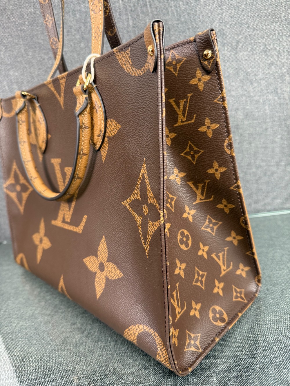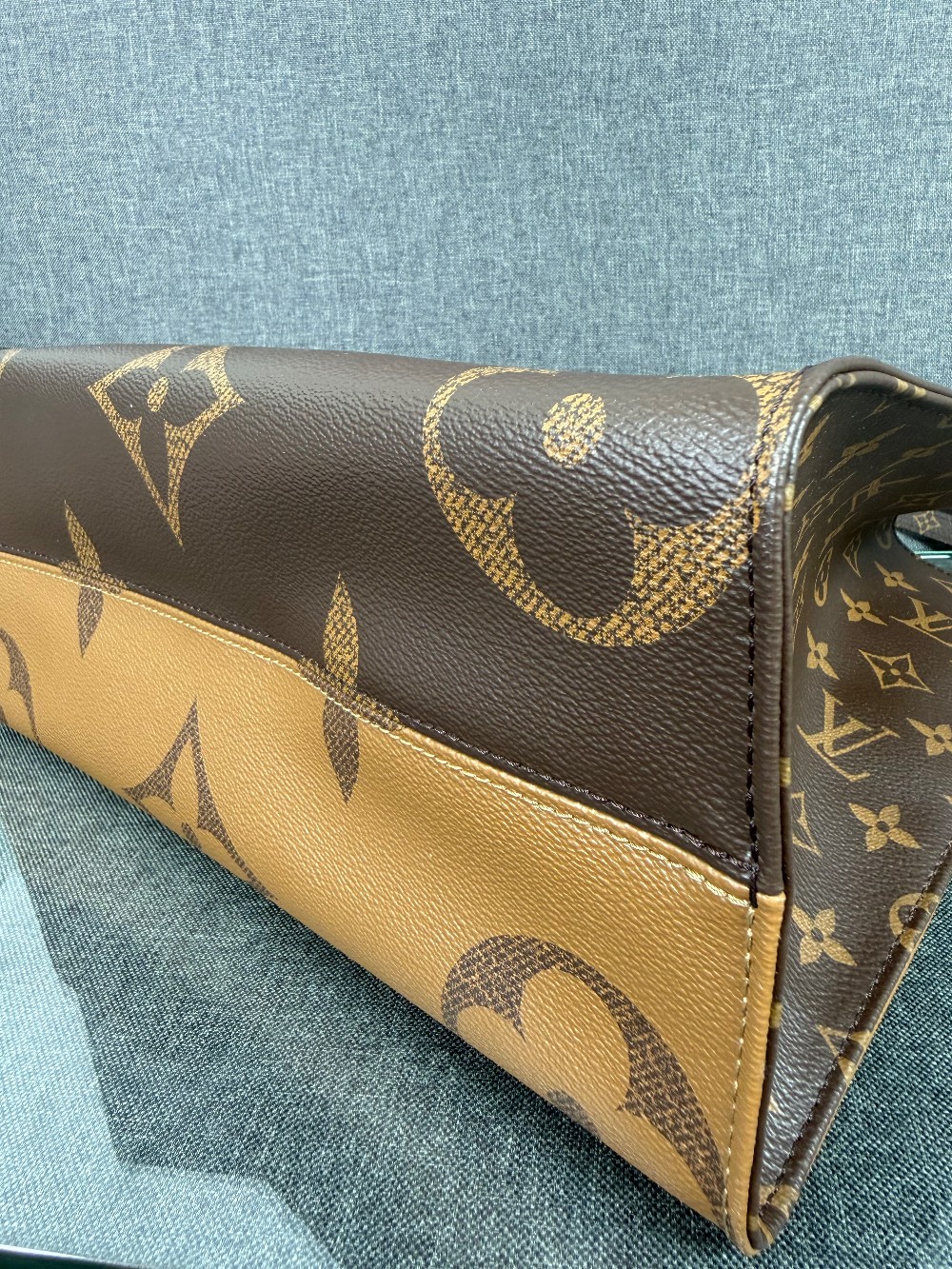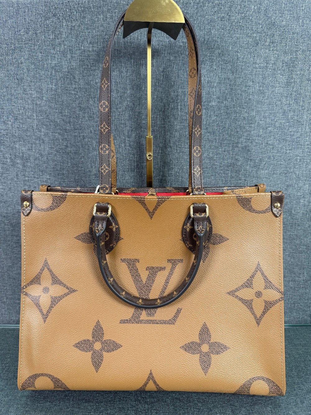 This is an authentic LOUIS VUITTON Reverse Monogram Giant Onthego MM. This limited edition tote features oversized and smaller sized versions of the classic Louis Vuitton monogram printed in brown on coated canvas in beige. The bag features rolled top handles and long shoulder straps that can be tucked away inside the bag, accented with polished brass hardware. The top is open to a spacious red fabric interior with zipper and patch pockets. This is a gorgeous tote with an exceptional look for a day of play, from Louis Vuitton!