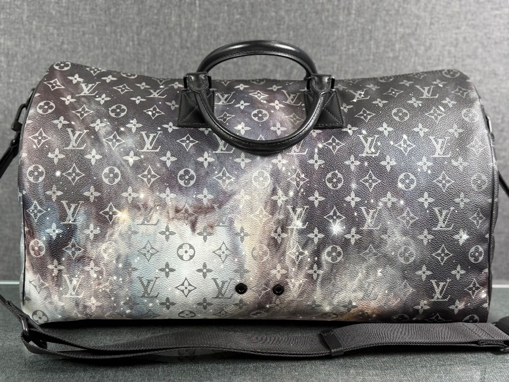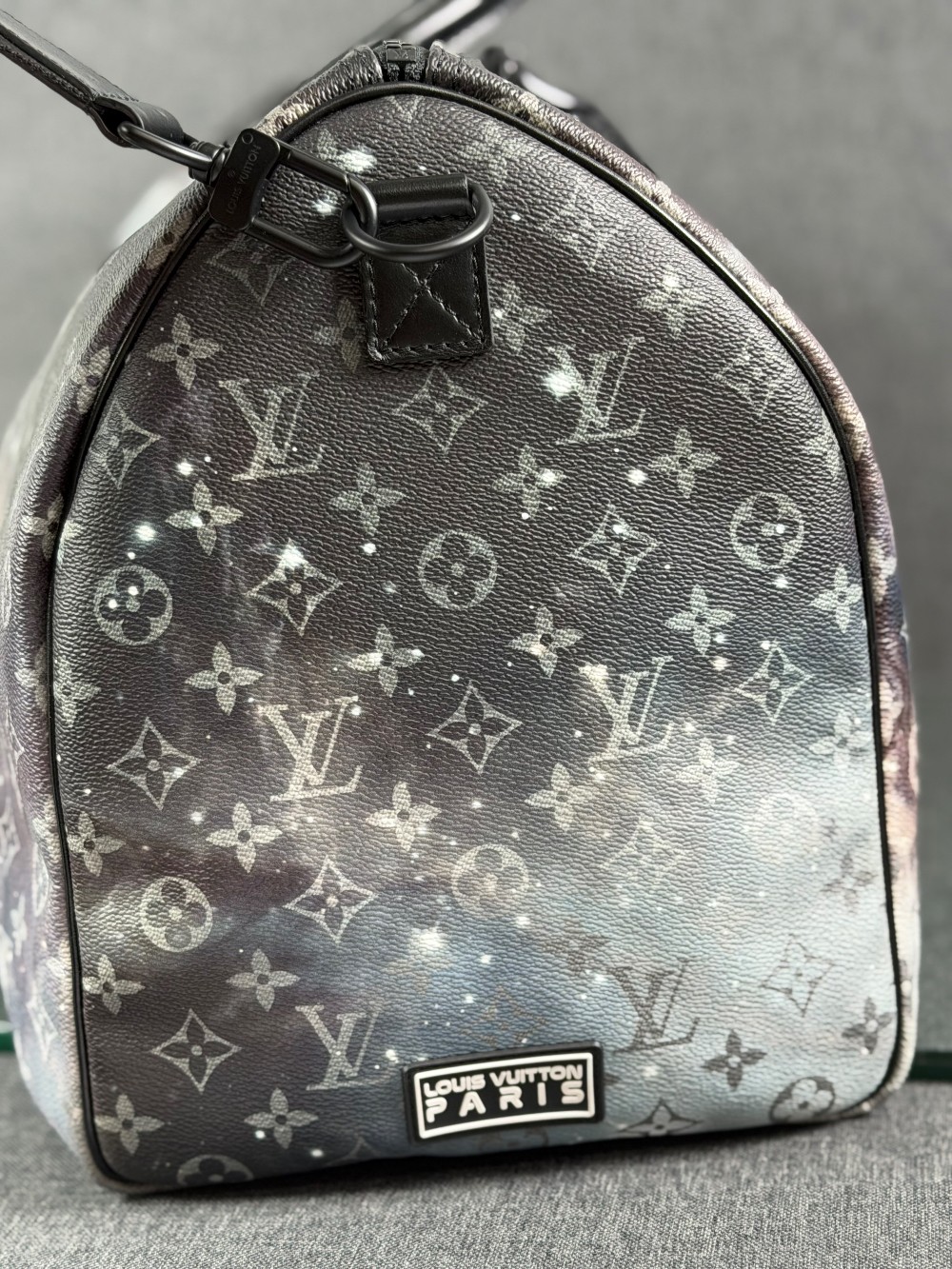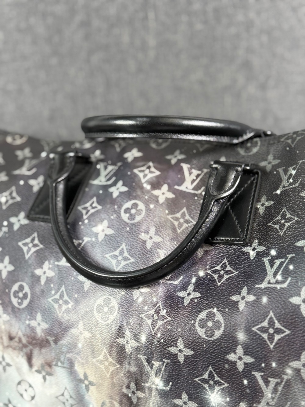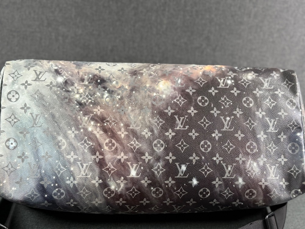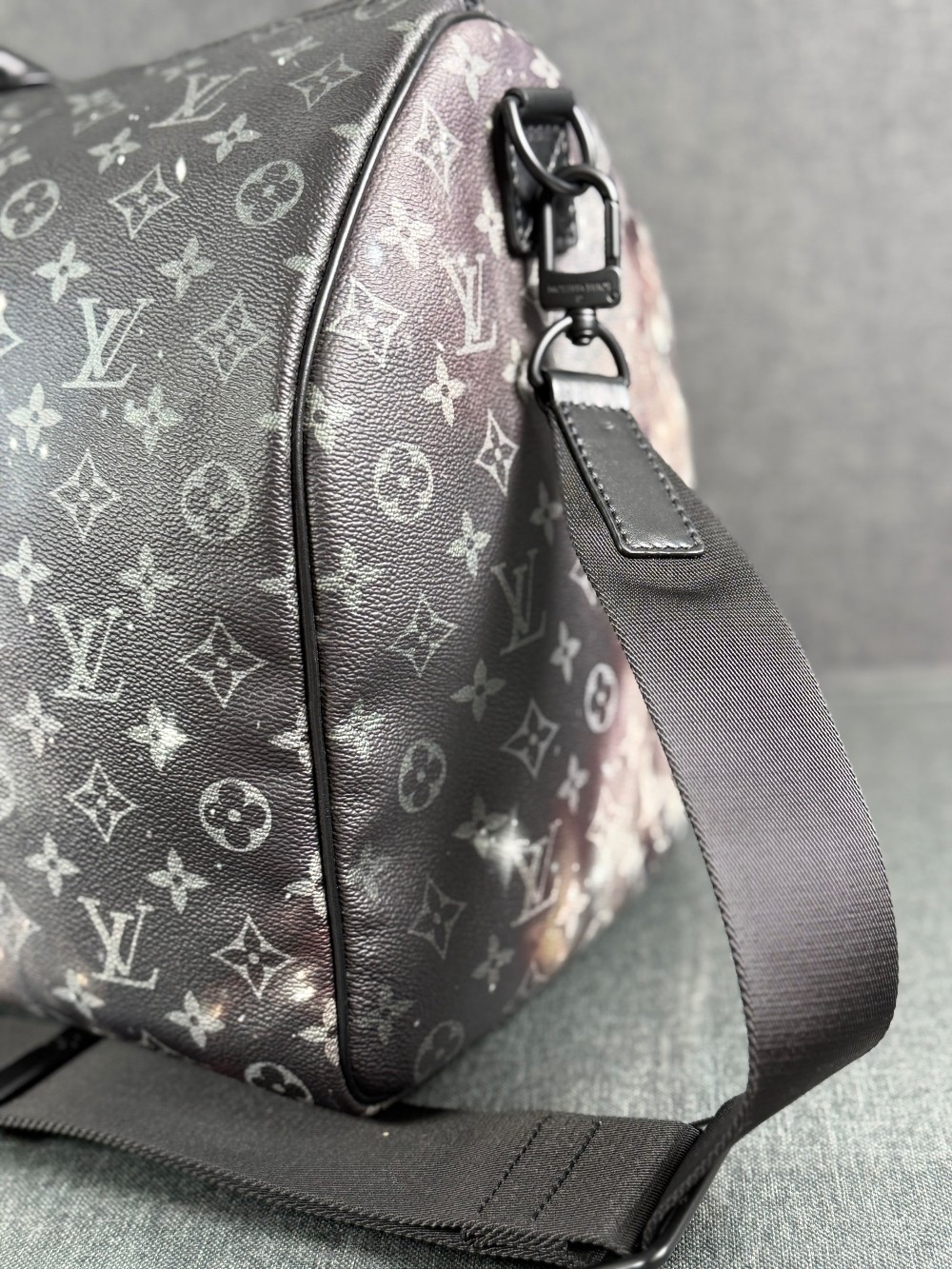 This is an authentic LOUIS VUITTON Monogram Galaxy Keepall Bandouliere 50 Galaxy Gray. This stylish duffel is crafted of signature Louis Vuitton monogram on toile canvas with a galaxy art scene exterior. This shoulder bag features an optional adjustable strap with matte black clasps, leather trim and rolled top handles. The matte black top zippers open to a spacious black fabric interior with a zipper pocket.