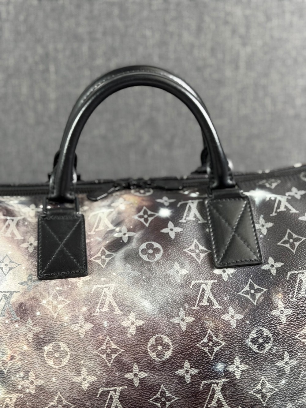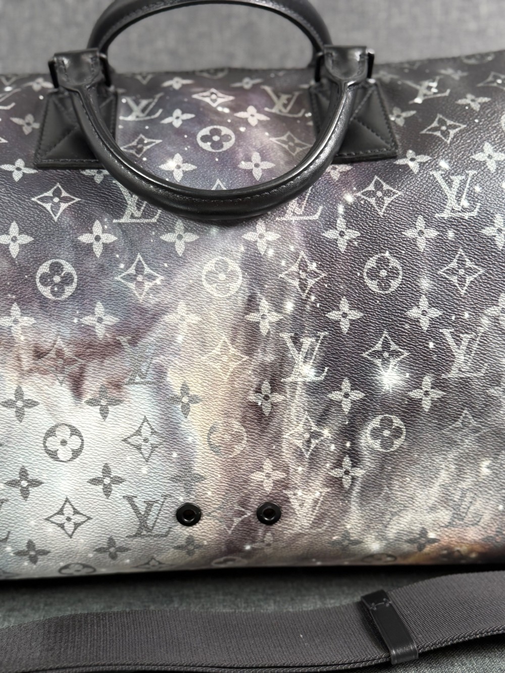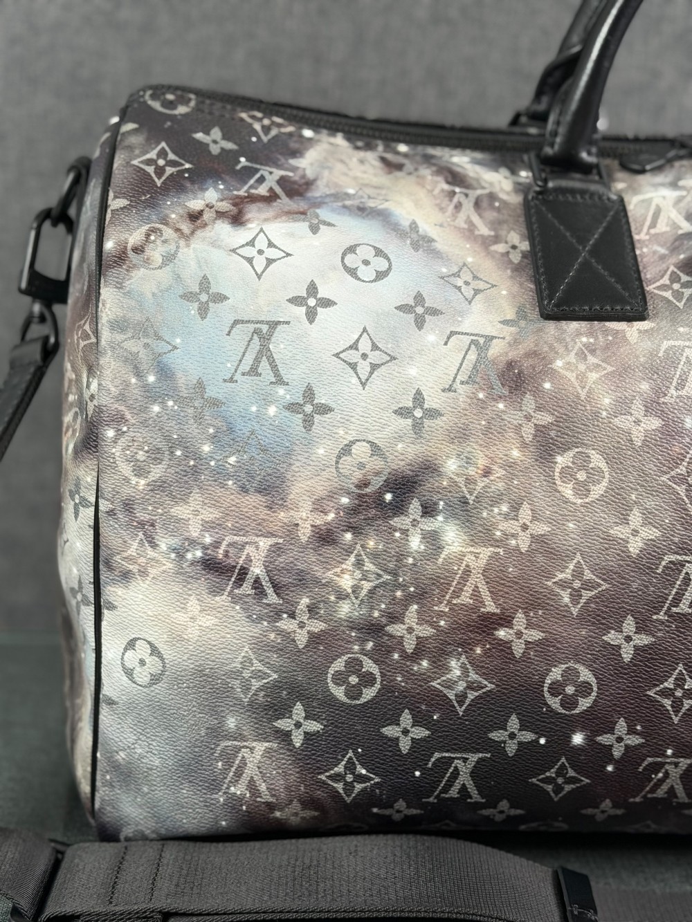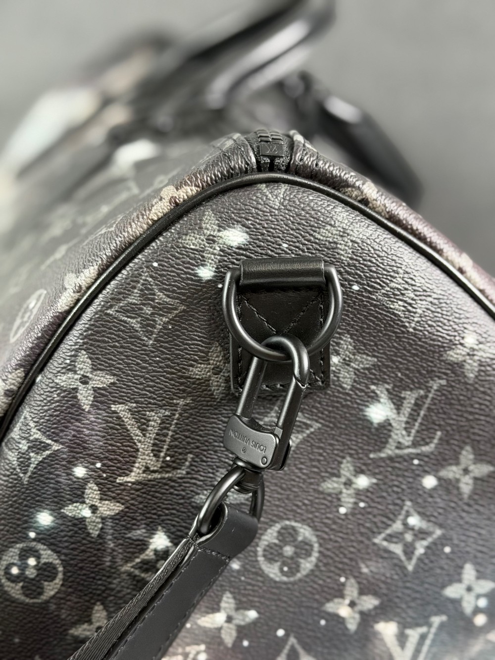This is an authentic LOUIS VUITTON Monogram Galaxy Keepall Bandouliere 50 Galaxy Gray. This stylish duffel is crafted of signature Louis Vuitton monogram on toile canvas with a galaxy art scene exterior. This shoulder bag features an optional adjustable strap with matte black clasps, leather trim and rolled top handles. The matte black top zippers open to a spacious black fabric interior with a zipper pocket.