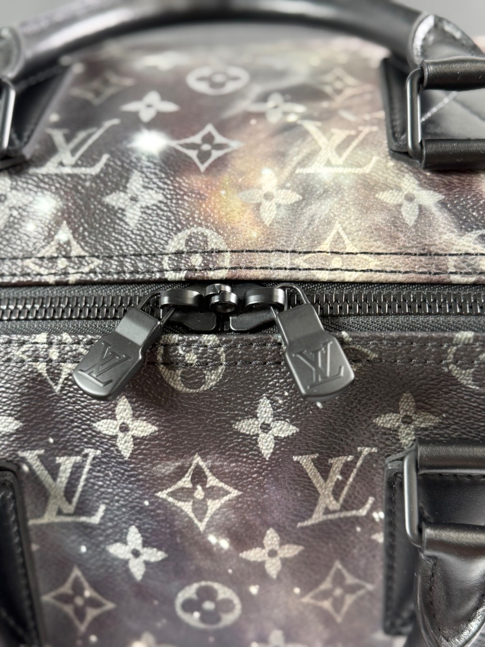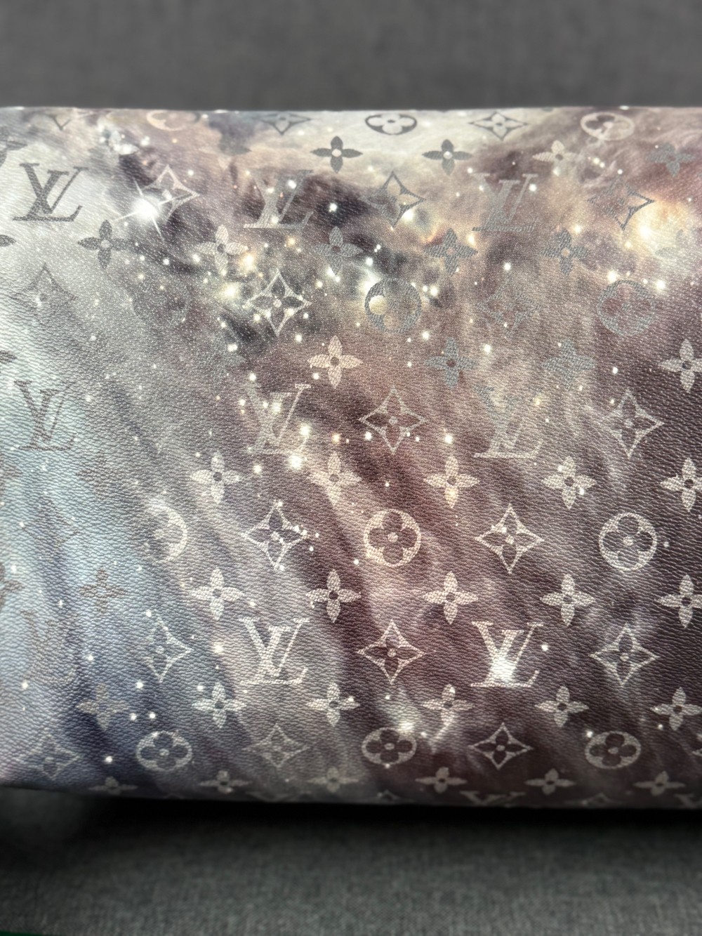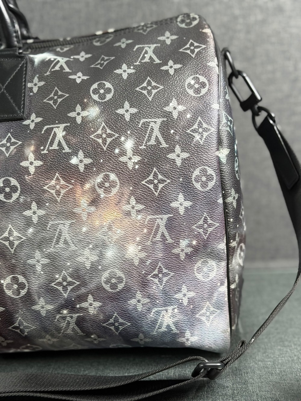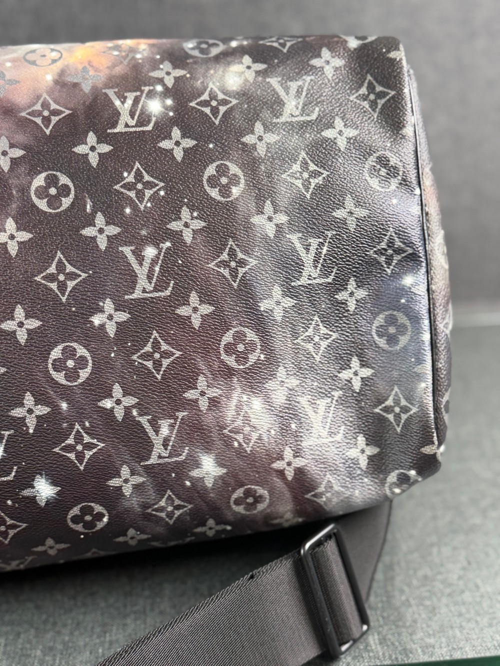 This is an authentic LOUIS VUITTON Monogram Galaxy Keepall Bandouliere 50 Galaxy Gray. This stylish duffel is crafted of signature Louis Vuitton monogram on toile canvas with a galaxy art scene exterior. This shoulder bag features an optional adjustable strap with matte black clasps, leather trim and rolled top handles. The matte black top zippers open to a spacious black fabric interior with a zipper pocket.