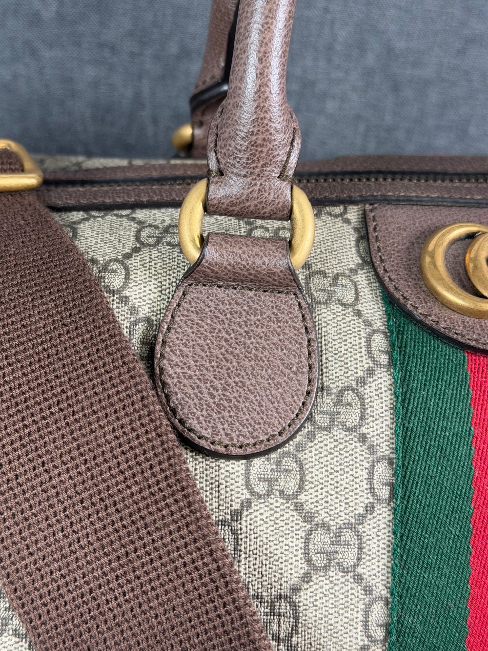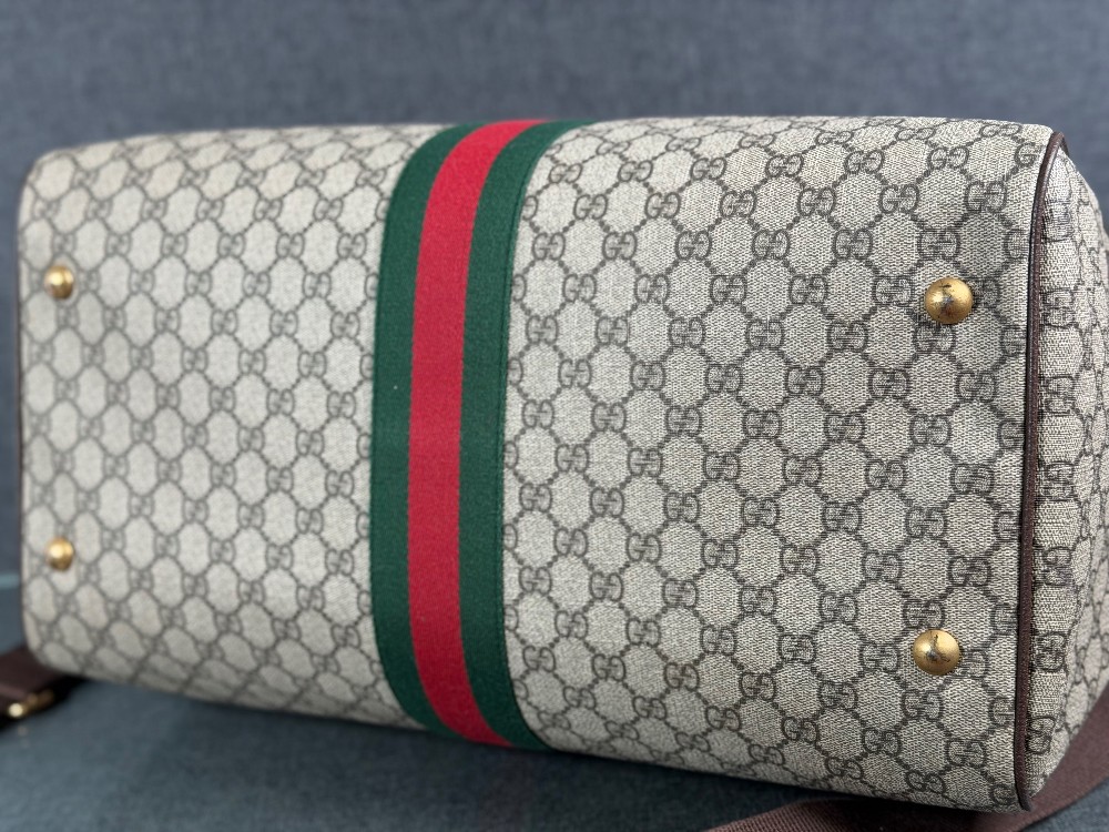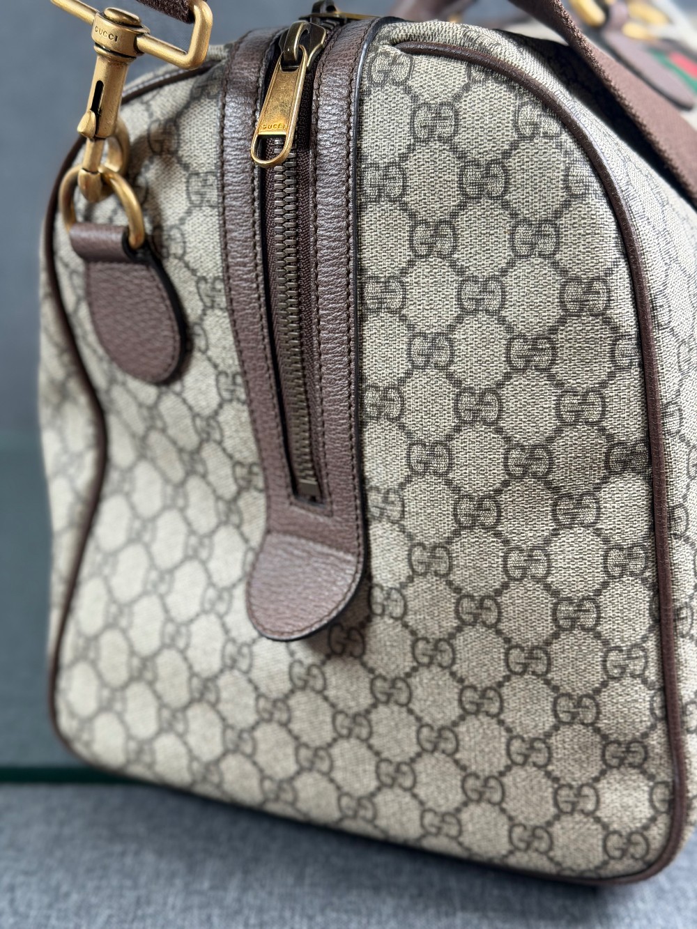This is an authentic GUCCI GG Supreme Monogram Textured Dollar Calfskin Web Medium Ophidia Carry-On Duffle Bag in Beige, Ebony, and New Acero. This stylish tote is crafted of Gucci GG monogram-coated canvas. The handbag features brown leather trim, leather top handles with gold hardware. The top zipper opens to a beige microfiber interior with a zipper pocket and removable insert.
