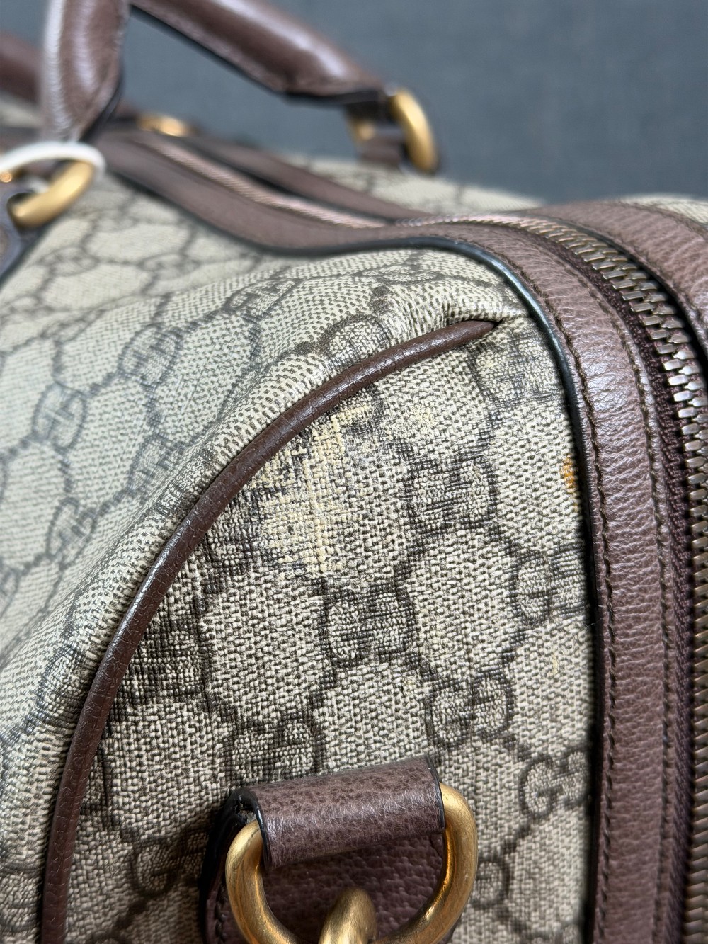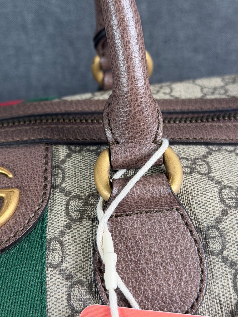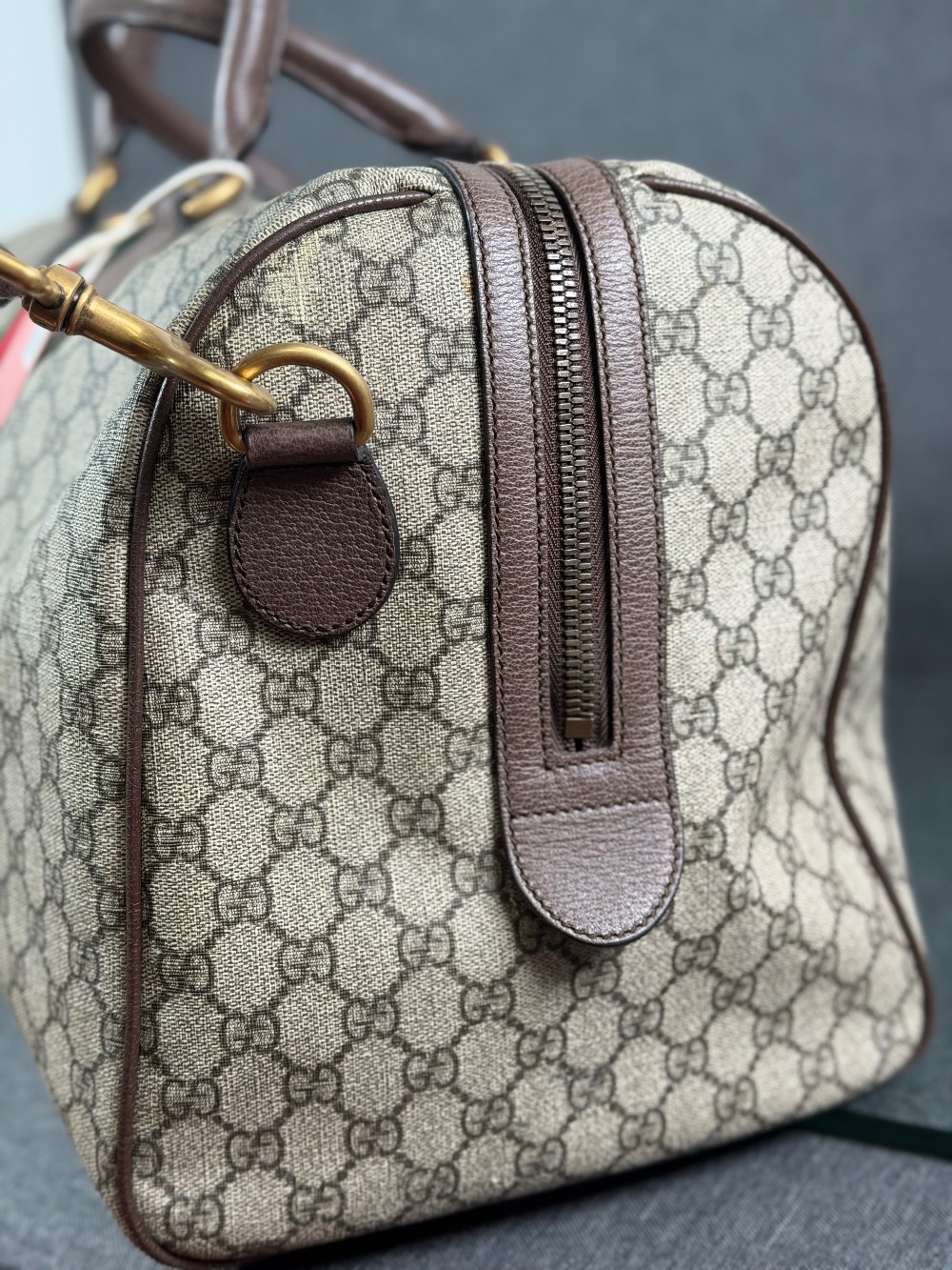 This is an authentic GUCCI GG Supreme Monogram Textured Dollar Calfskin Web Medium Ophidia Carry-On Duffle Bag in Beige, Ebony, and New Acero. This stylish tote is crafted of Gucci GG monogram-coated canvas. The handbag features brown leather trim, leather top handles with gold hardware. The top zipper opens to a beige microfiber interior with a zipper pocket and removable insert.