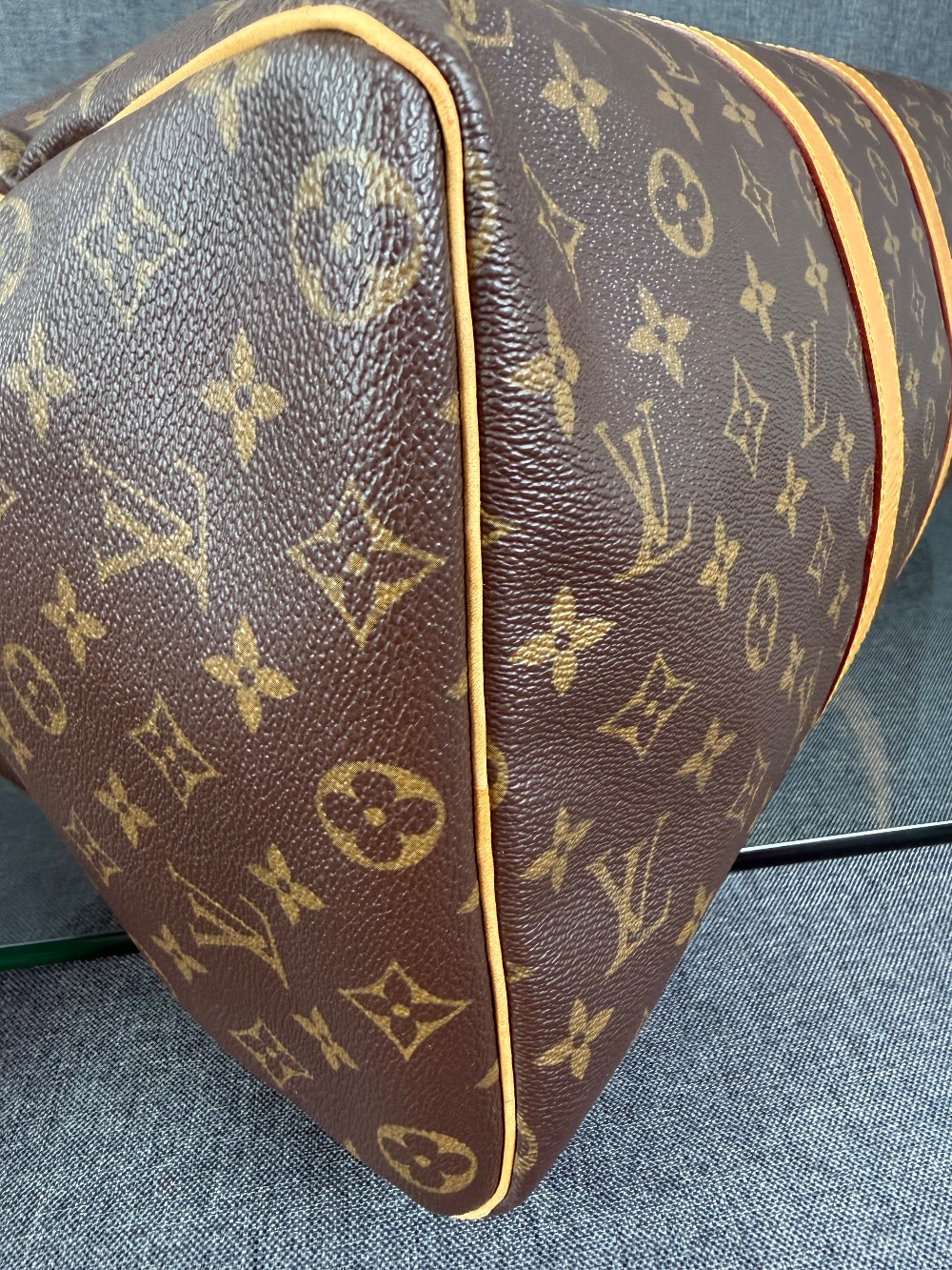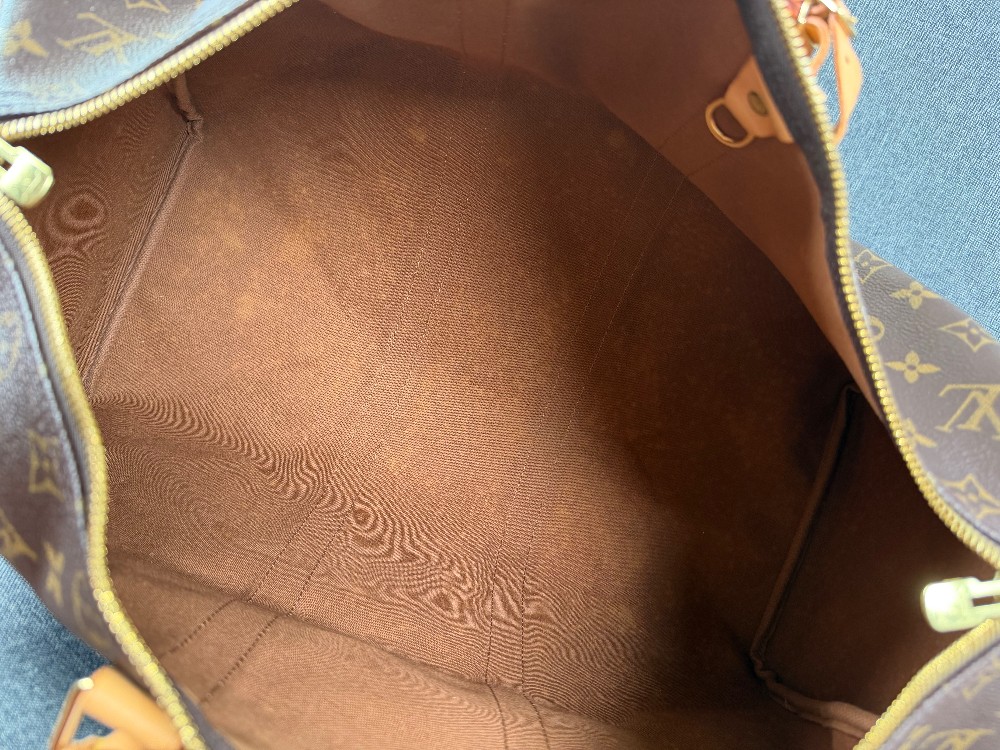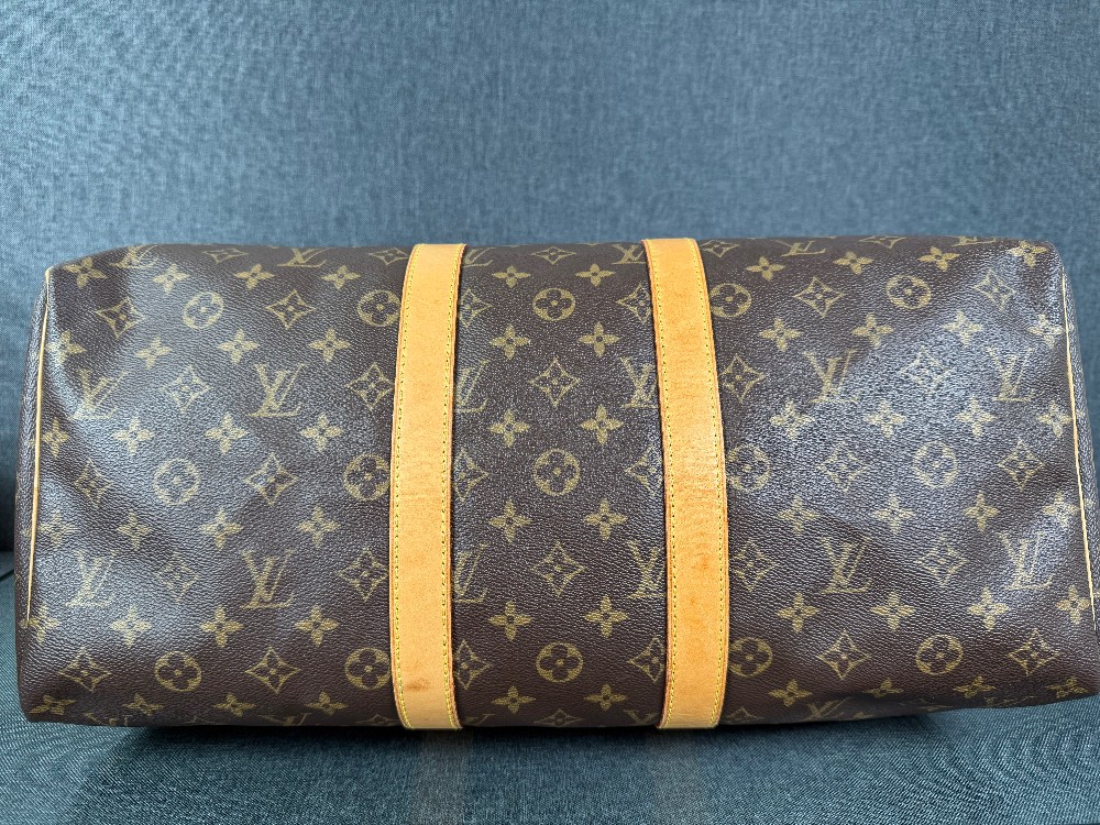 This is an authentic LOUIS VUITTON Monogram Keepall 45. This stylish duffel is crafted of monogram coated canvas. It features vachetta leather top handles and gold tone hardware. The top zippers open to a cocoa brown fabric interior.