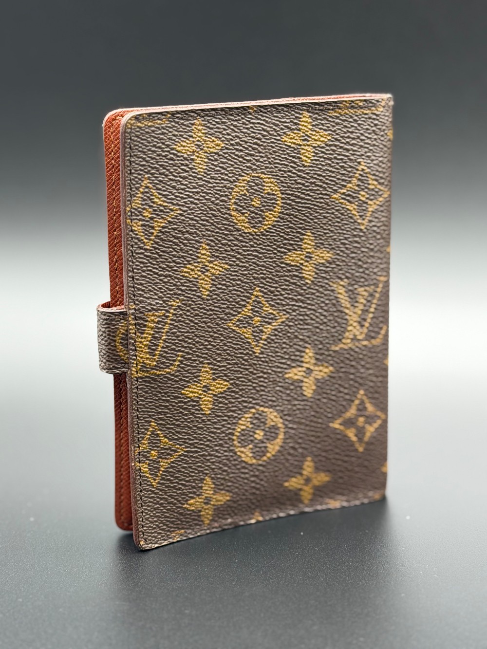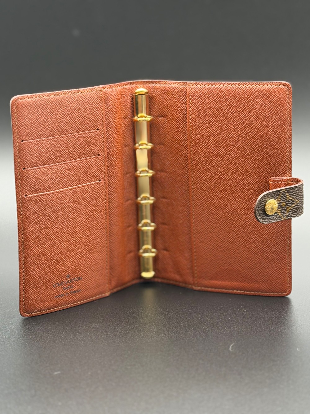 This is an authentic LOUIS VUITTON Monogram Small Ring Agenda Cover. This agenda features a monogram coated canvas exterior in brown and terracotta crossgrain leather interior. The snap opens to a brass 6-ring binder for inserts, three card slots, two side pockets, and a pen loop.