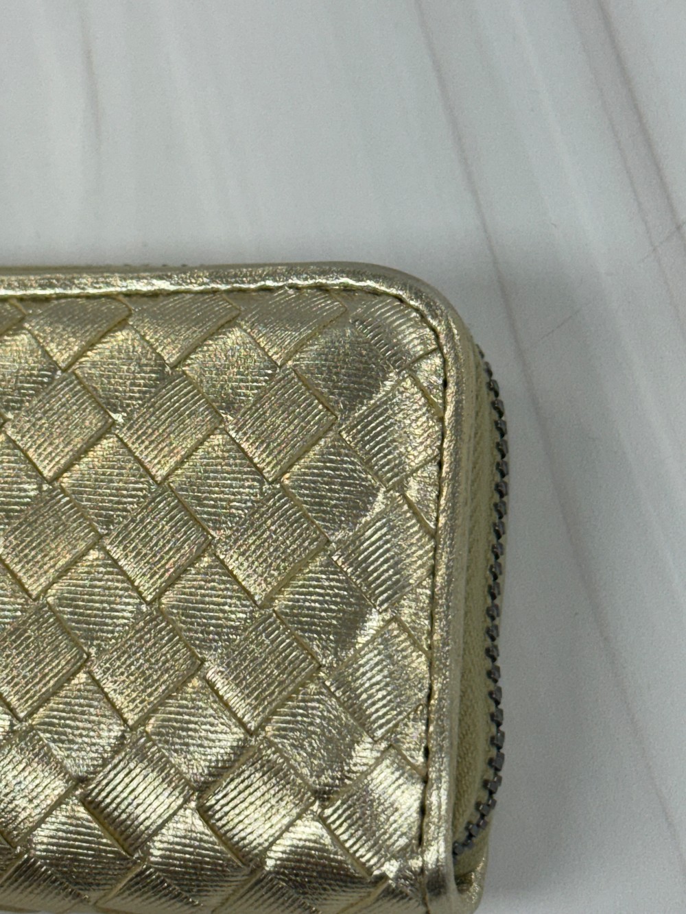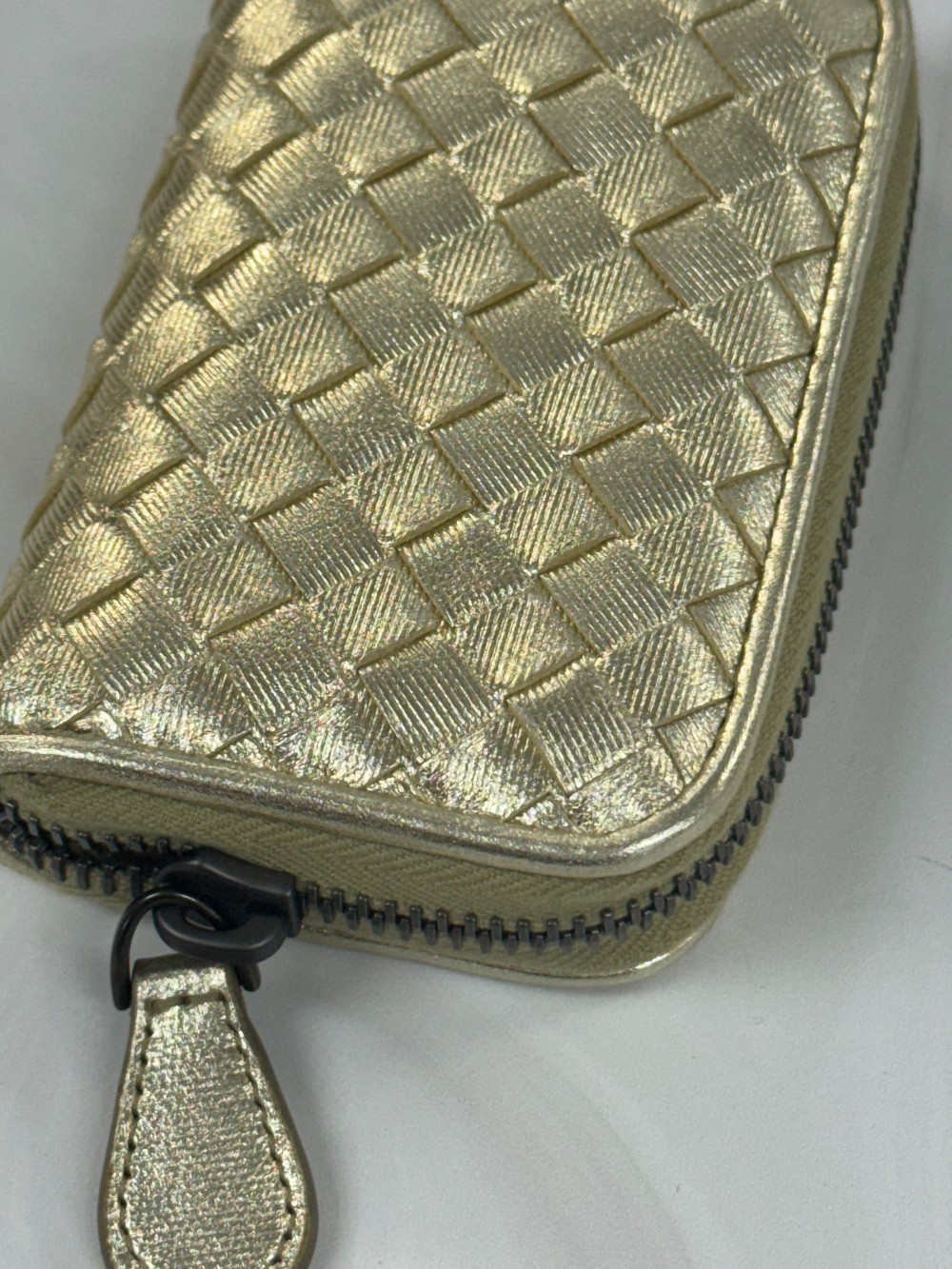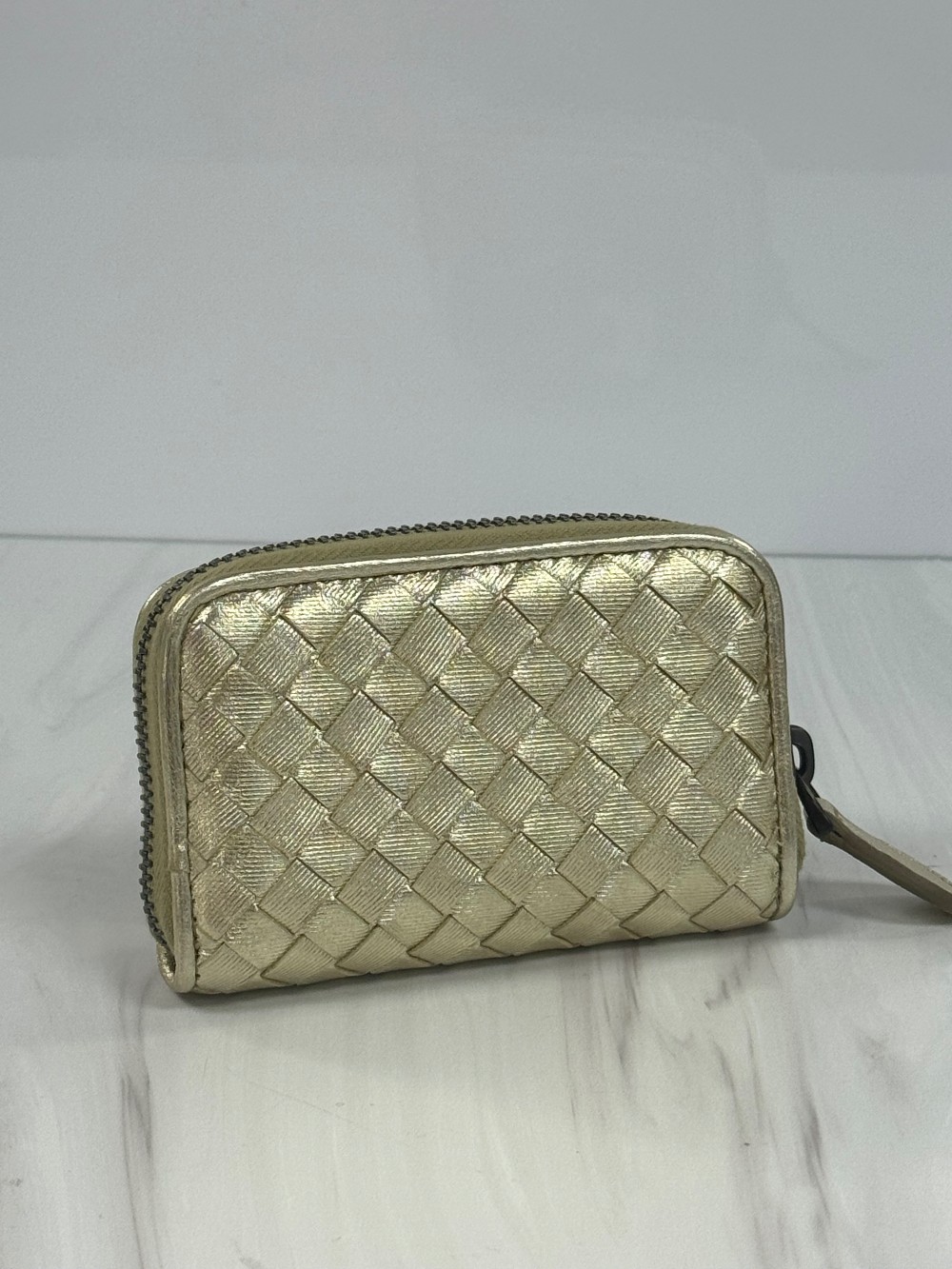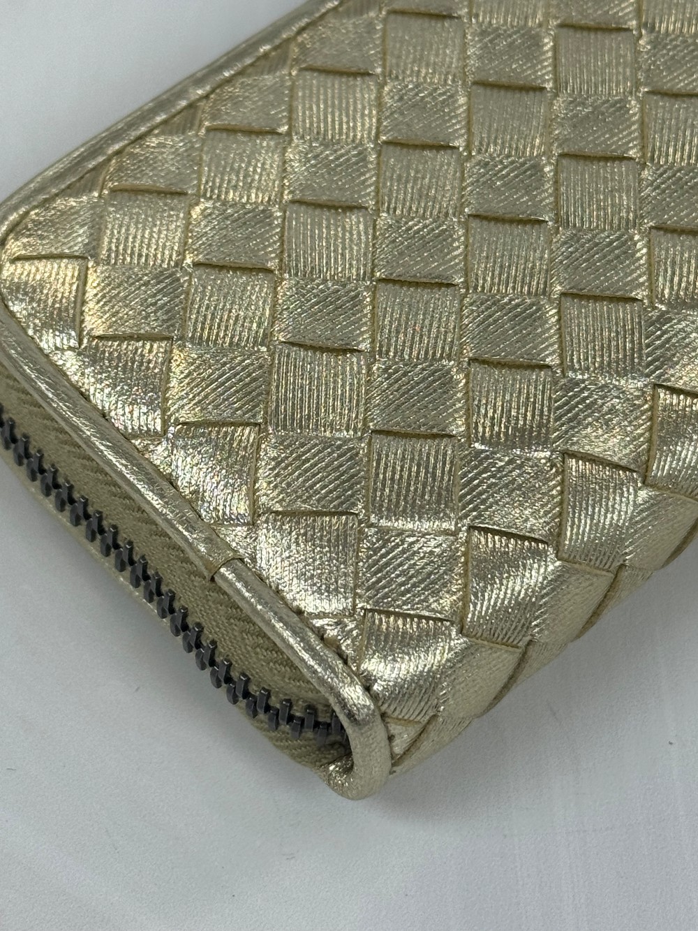 This is an authentic BOTTEGA VENETA Metallic Nappa Intrecciato Zip Around Coin Purse in Gold. This stylish wallet is crafted of tightly woven metallic leather in gold. The gunmetal wrap-around zipper opens to a partitioned brown leather interior.