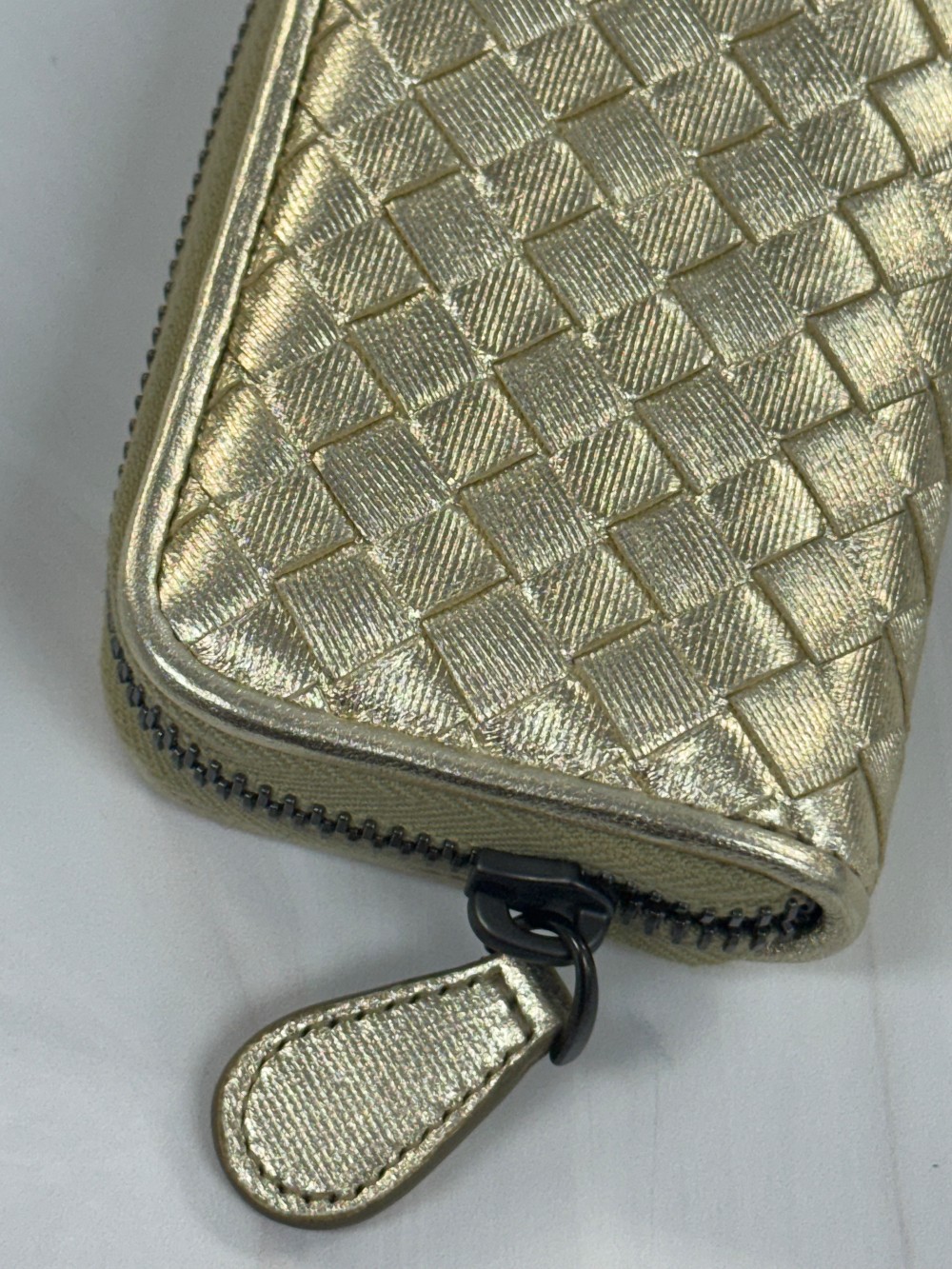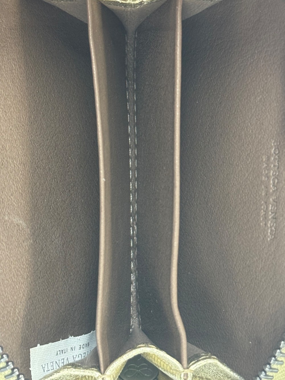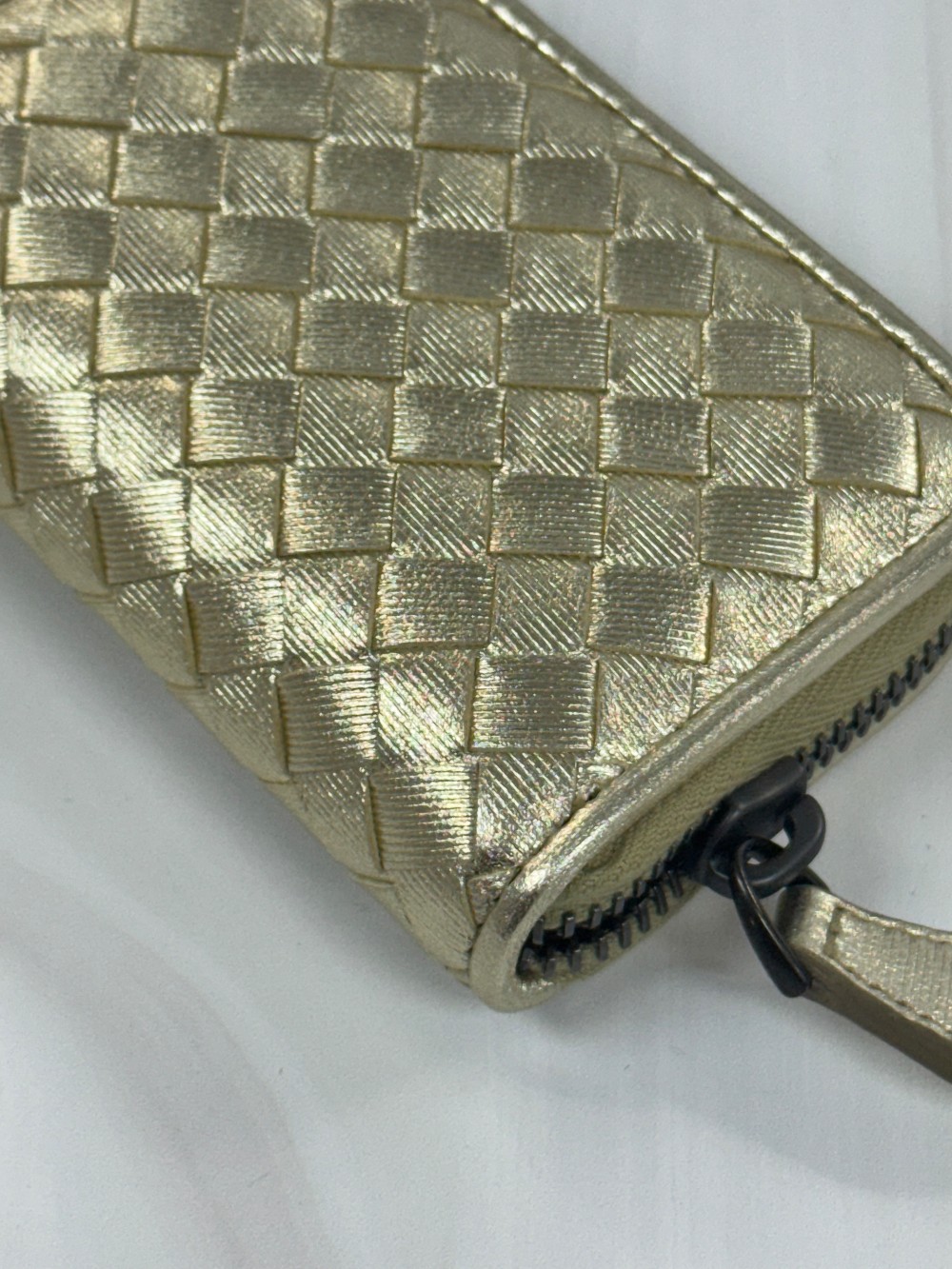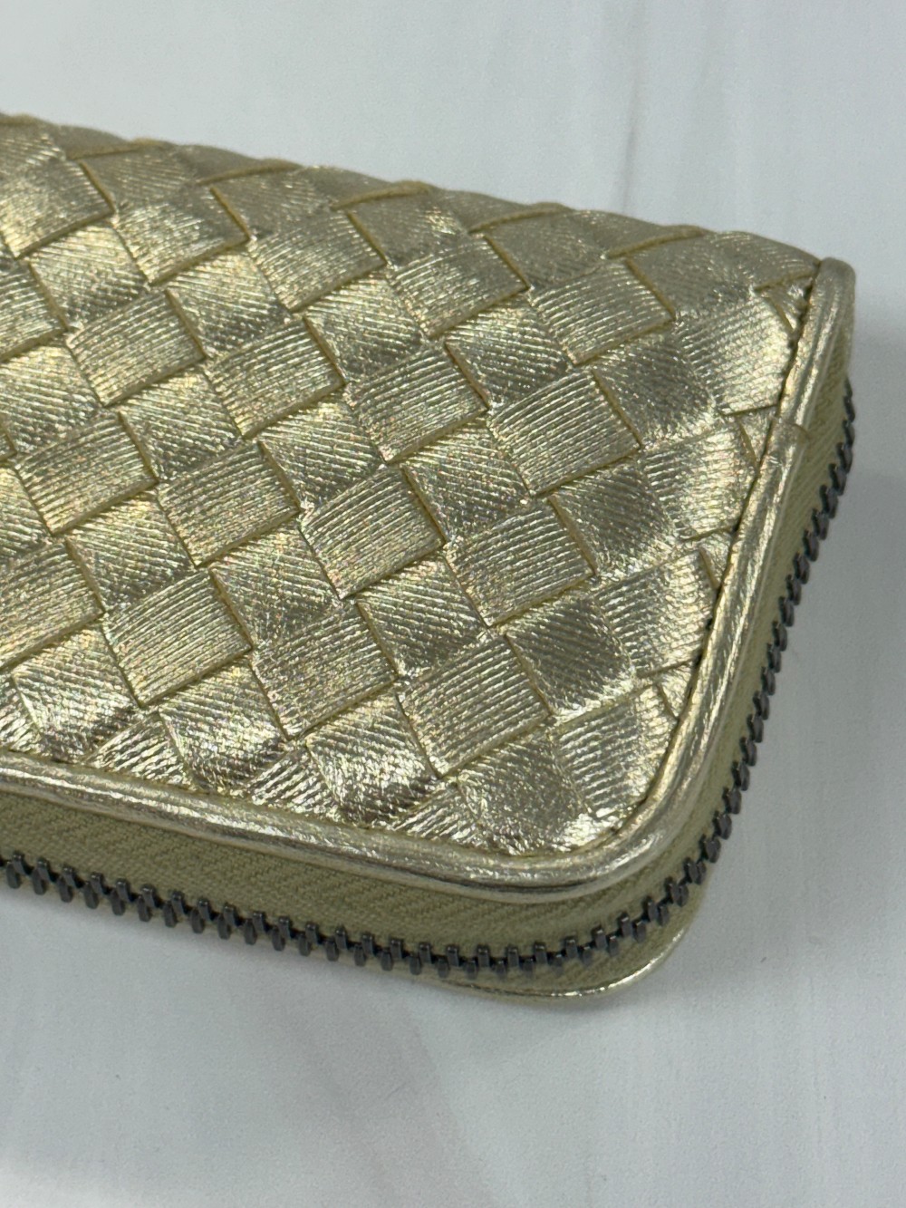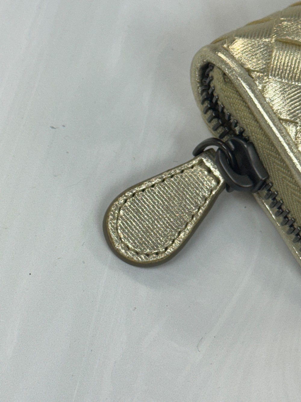 This is an authentic BOTTEGA VENETA Metallic Nappa Intrecciato Zip Around Coin Purse in Gold. This stylish wallet is crafted of tightly woven metallic leather in gold. The gunmetal wrap-around zipper opens to a partitioned brown leather interior.