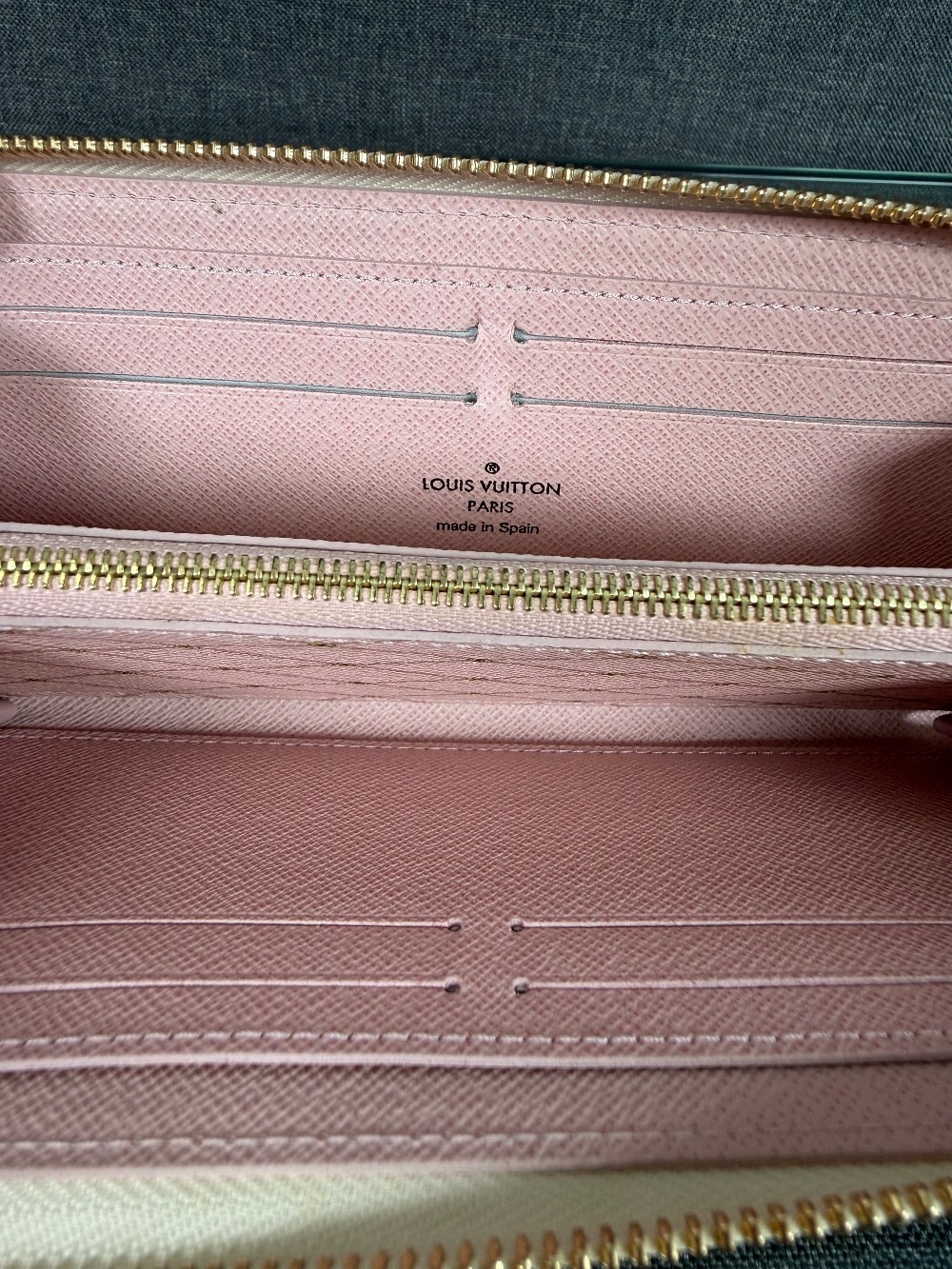 It is made from Damier Azur coated canvas with a grained cowhide-leather lining and trim. It features gold-color hardware, including a zip-around closure. The interior is designed for organization and typically includes: Two large gusseted compartments, a zipped coin pocket, multiple card slots.